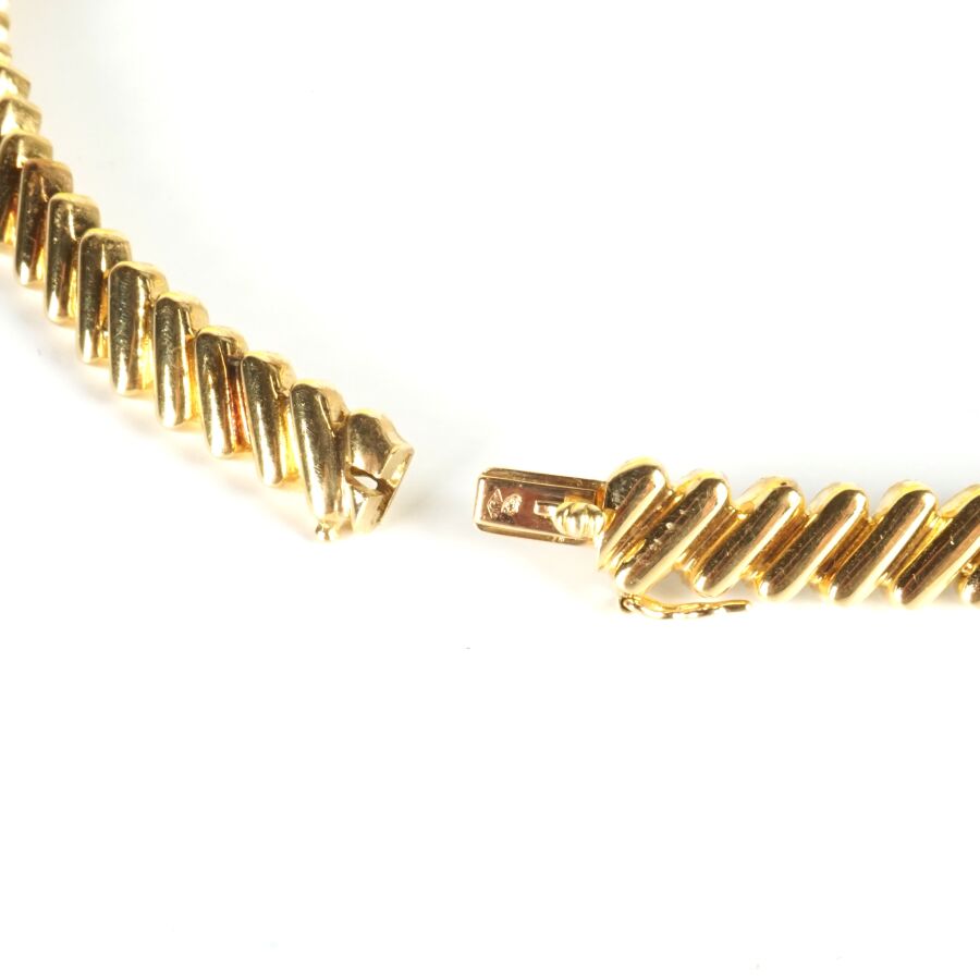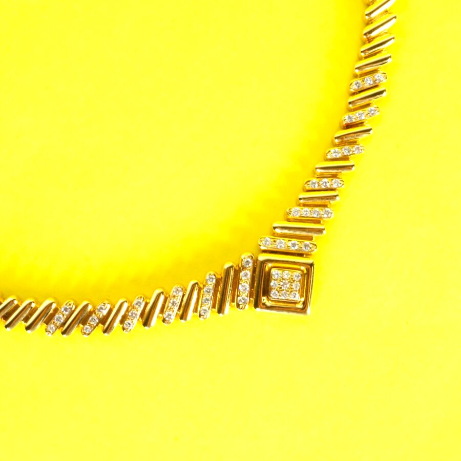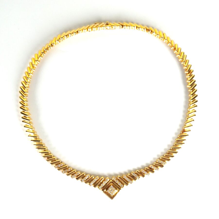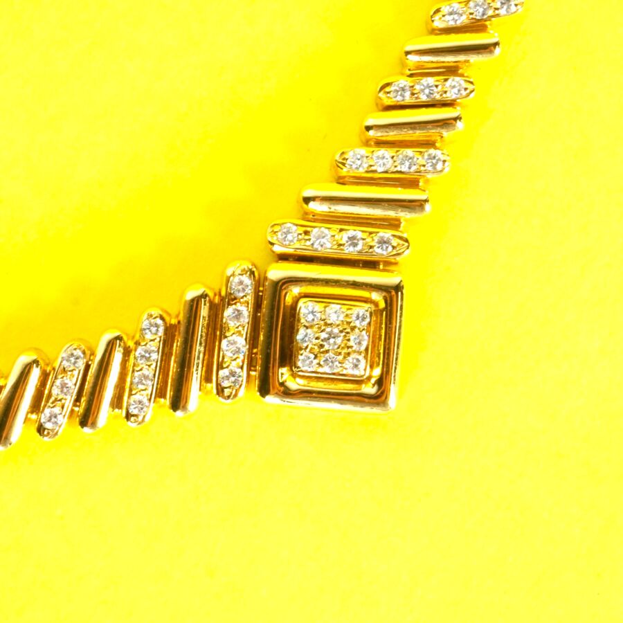 Collier rigide en or jaune 18K (750/oo), maillons formés de lignes disposées en chute, retenant un pendentif losangé serti en son centre de 9 diamants taille brillant encadrés de 2x6 lignes serties de 40 diamants, calibrant au total 0.45/0.5 cts environ, fermoir à cliquet et 8 de sécurité, H. Pendentif : 1.9 cm. Larg. Maille : de 0.7 cm à 1.2 cm. Diam. Tour de cou : 12.7 cm environ. Poids brut : 56.6 g environ.