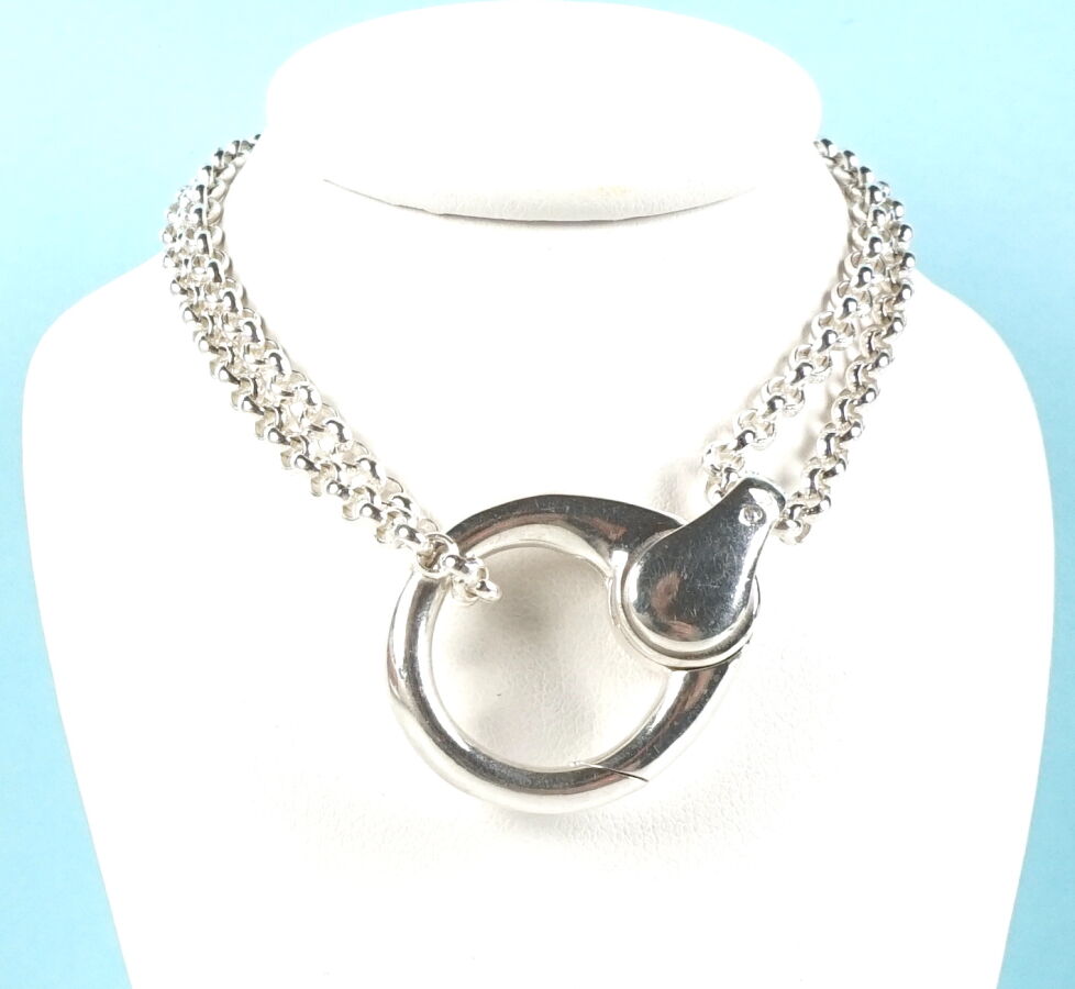 Collier "Sautoir" à transformation en argent (925/oo), la maille jaseron agrémentée d'un important mousqueton pouvant retenir un pendentif ou former fermoir, L. 85 cm. Poids brut : 171.5 g environ.