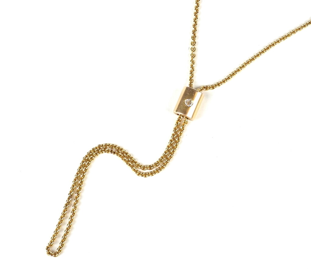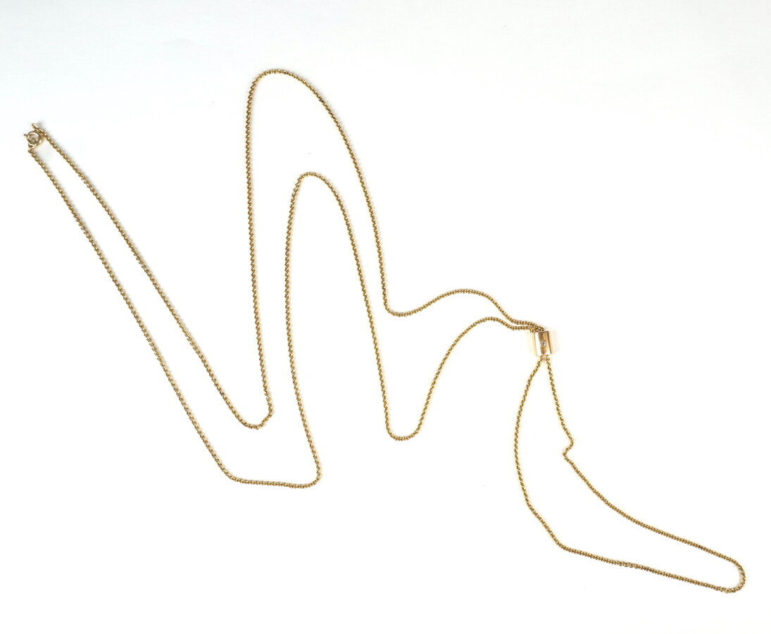 Collier "Sautoir" en or jaune 14K (585/oo), la chaine maille forçat agrémentée d'un coulisseau (7 x 9 mm), serti clos d'un petit diamant taille ancienne calibrant 0.05 ct environ, fermoir mousqueton, L. max. : 124 cm. Poids brut : 15.74 g environ.