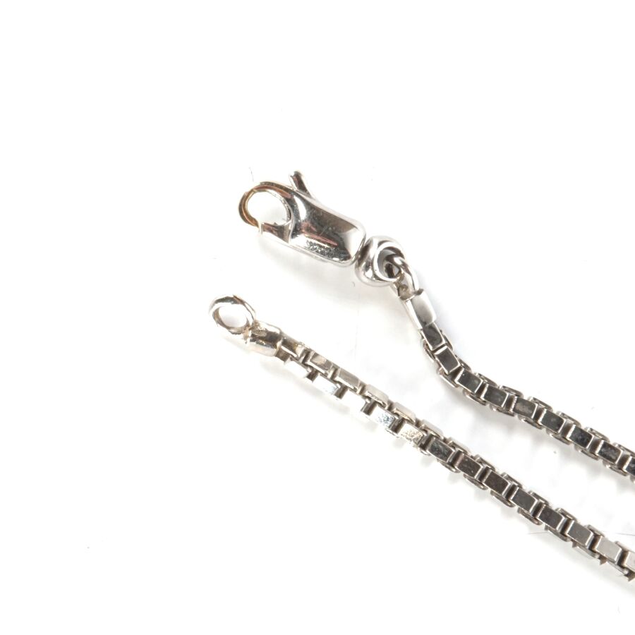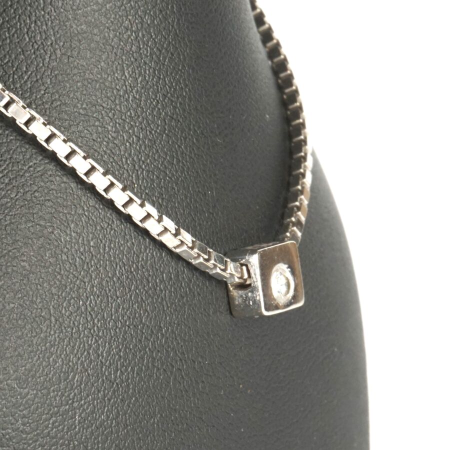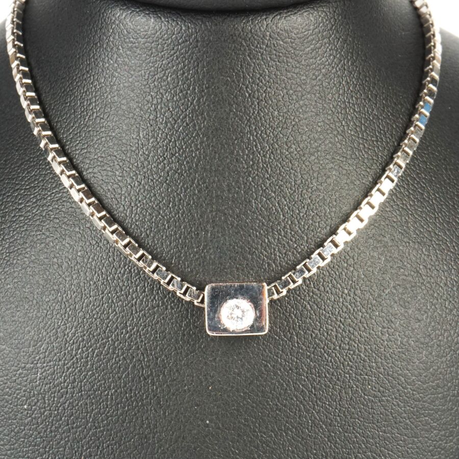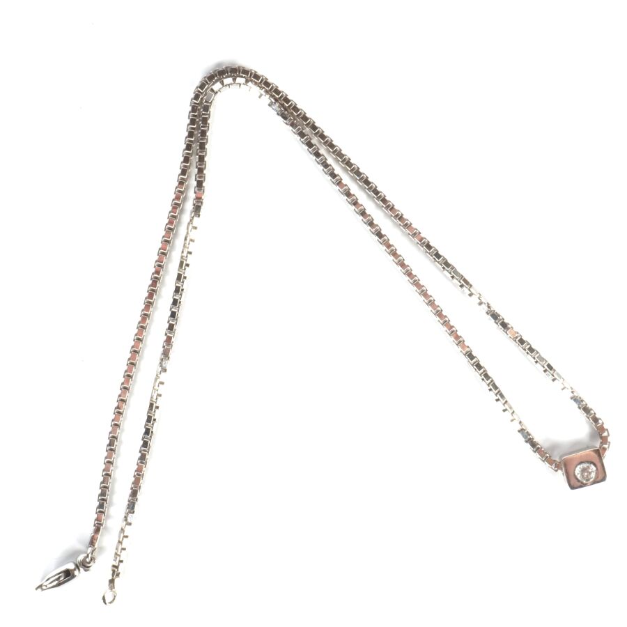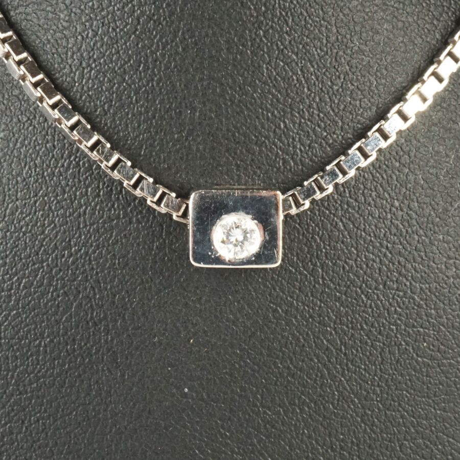 Collier "Solitaire" en or gris 18K (750/oo), maille vénitienne retenant un pendentif coulisseau serti clos d'un diamant taille brillant (D. 4 mm), calibrant 0.2 cts environ, fermoir mousqueton, L. Totale : 42 cm. Larg. Maille : 2 mm. Dim. Pendentif : 6 x 8 mm. Poids brut : 15 g environ.