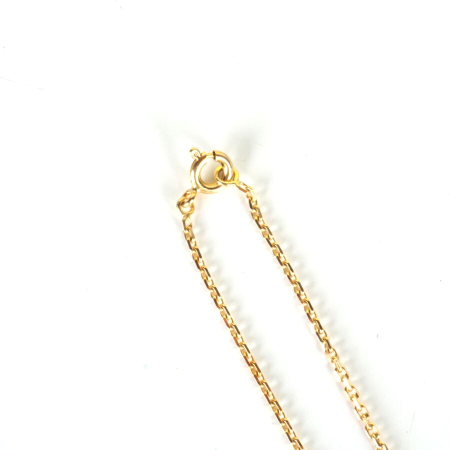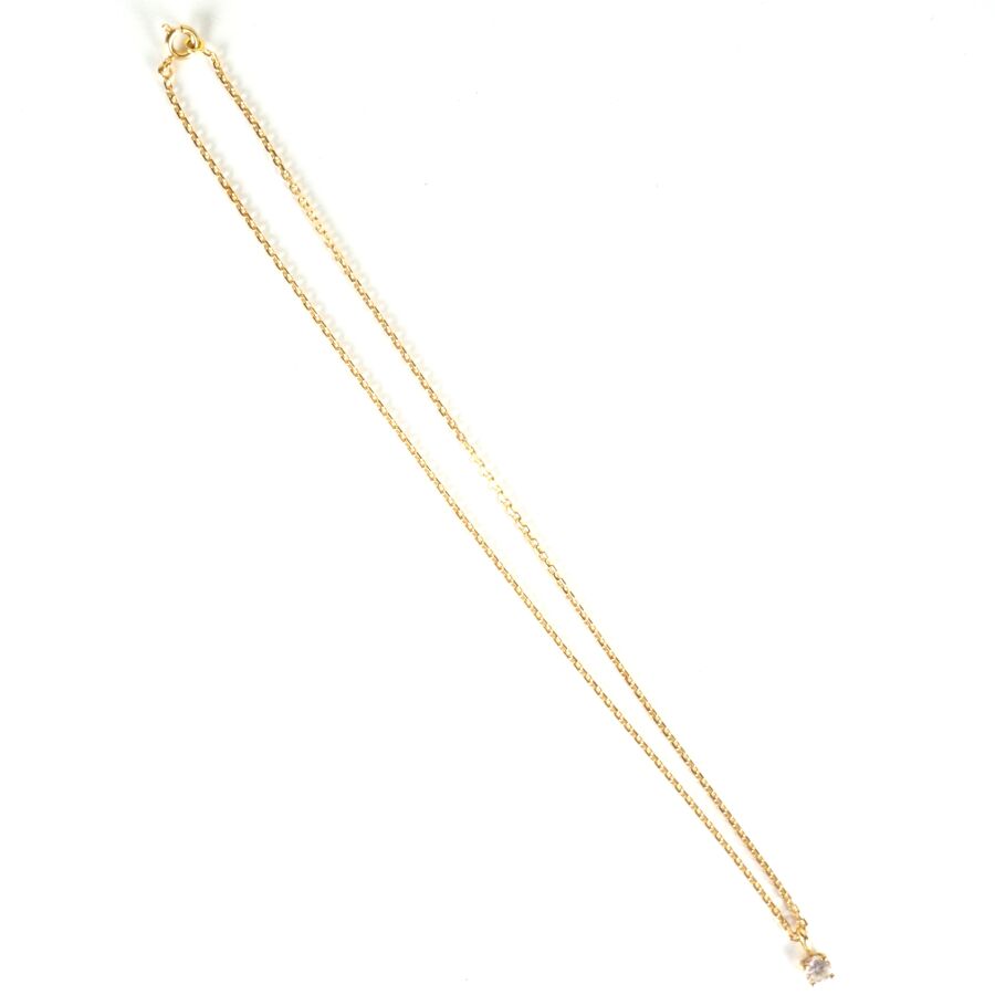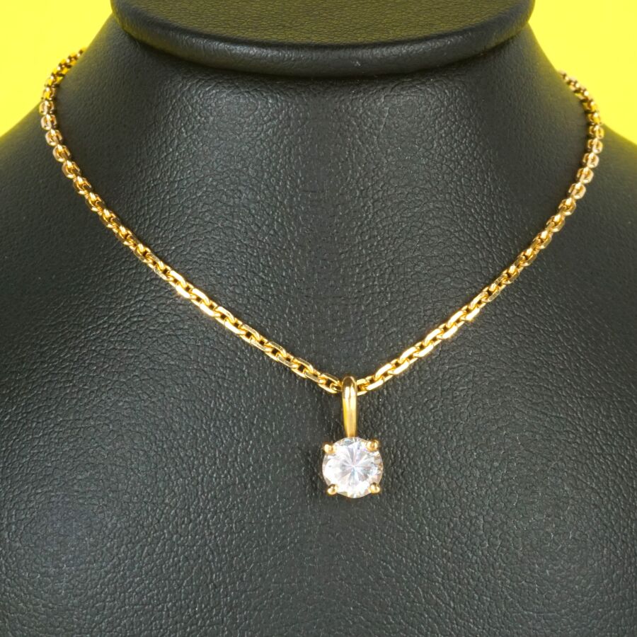 Collier "Solitaire" en or jaune 18K (750/oo), chaîne maille forçat, retenant un pendentif serti quatre griffes d'une pierre blanche de taille ronde imitant le diamant (D 5.5 mm), fermoir à anneau ressort, L. 40.2 cm. H. Pendentif ; 1.1 cm. Poids brut : 5.2 g environ.