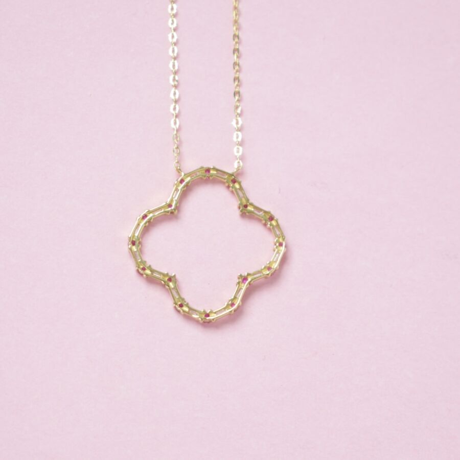 Collier "Trêfle" en or jaune 18K (750/oo), serti de seize diamants taille tapers pour environ 0.3 ct alterné de seize rubis ronds pour 0.3 ct, fermoir anneau ressort, Dim. Motif : 22 x 22 mm, Long. Chaîne : 39 à 45 cm, Poids brut : 1.9 g environ.