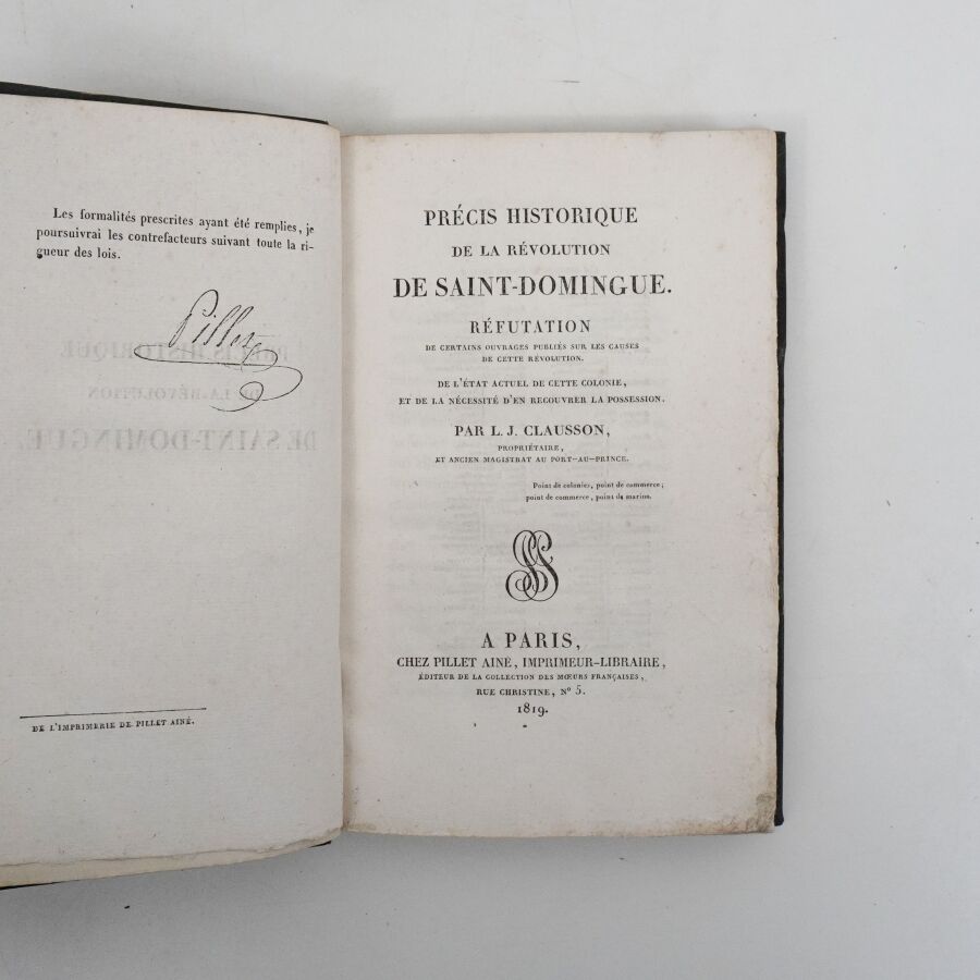 Colonies - CLAUSSON (L. J.). Précis historique de la révolution de Saint-Domingue. Réfutation de certains ouvrages publiés sur les causes de cette révolution. De l'état actuel de cette colonie, et de la nécessité d'en recouvrer la possession. Paris, Pillet ainé, 1819. In-8 de [2] ff., xii-155 pp., [4] pp. (catalogue libraire). Première édition.