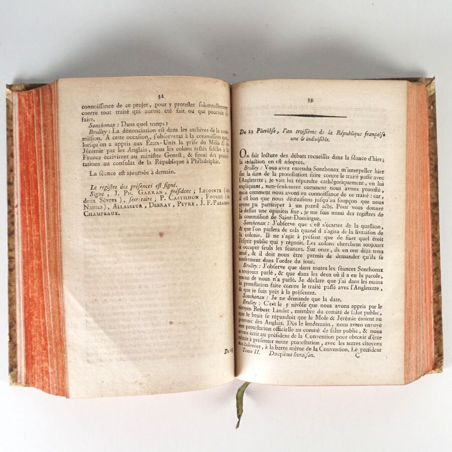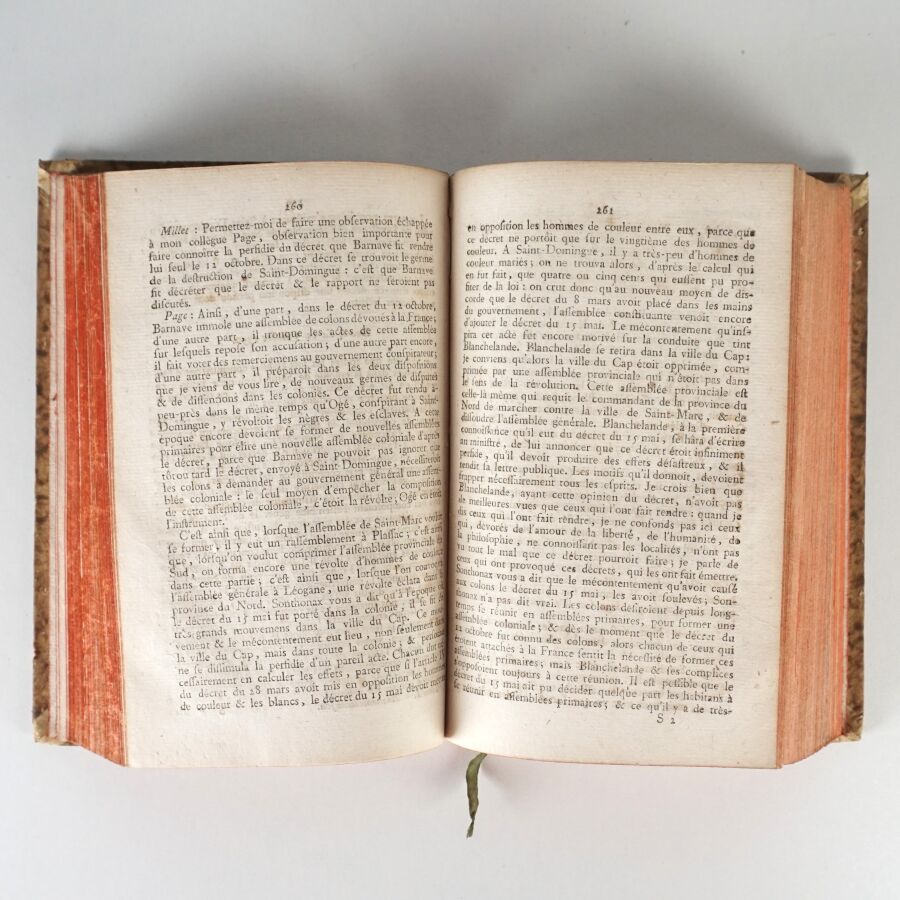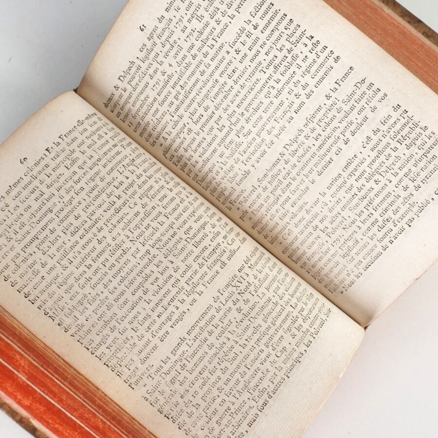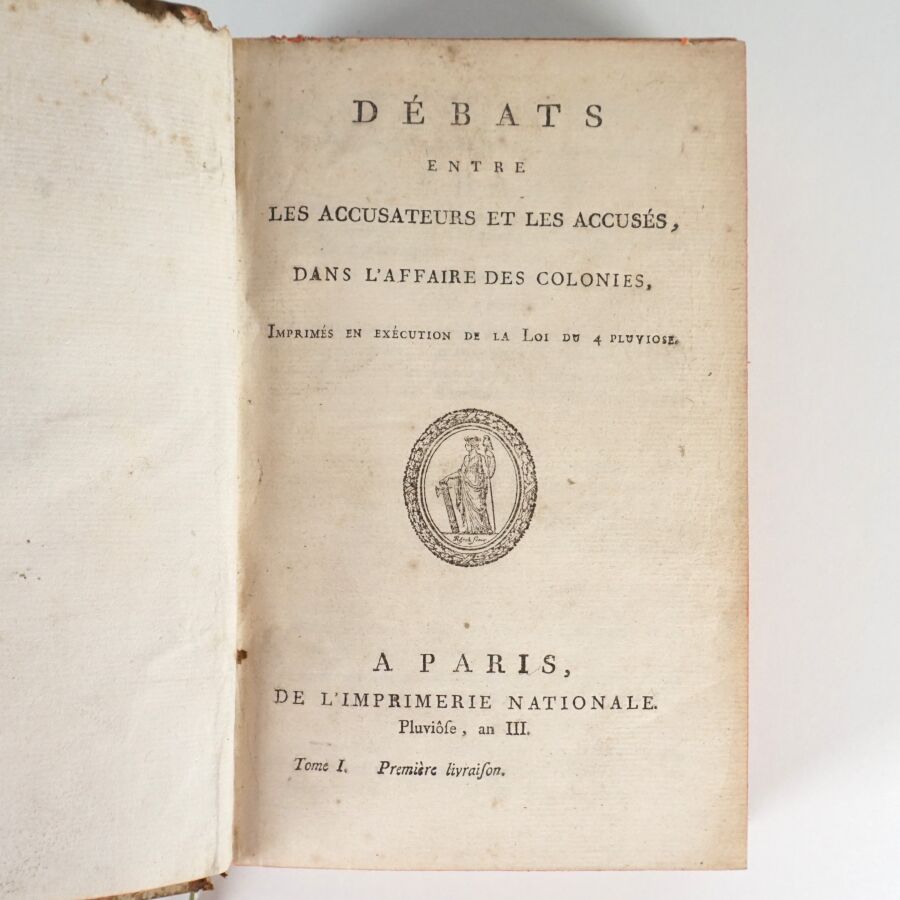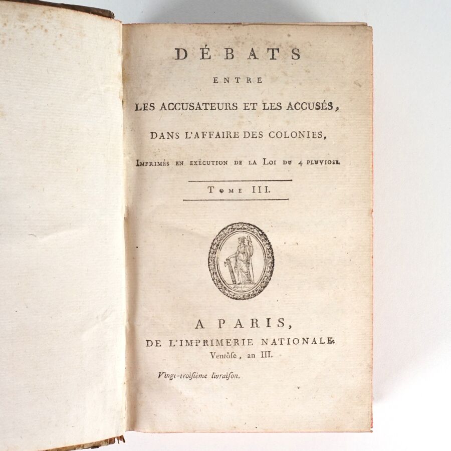 [COLONIES]. Débats entre les accusateurs et les accusés, dans l'Affaire des colonies, imprimés en exécution de la loi du 4 pluviose. Paris, Imprimerie Nationale, Pluviôse, an III. 4 tomes en 2 volumes in-8 de 369 pp., 354 pp., 383 pp., 390 pp. Demi-veau marbré, dos lisse orné, p. de titre (reliure de l'époque). Epidermures et rongés.