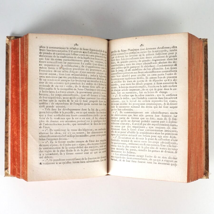 Intéressante provenance en rapport avec le sujet : ex-libris héraldique (de sable au chevron d'argent à la devise ""Ne Furori"") de la famille Fournier de Bellevue (Berry, Saint-Domingue, Bretagne), signé par le vicomte X. de Fournier de Bellevüe, 1892. Jean-Jacques Fournier de Varennes, dit le marquis de Bellevue (né en 1739 à Saint-Domingue, mort guillotiné à Paris en 1794), était un officier, planteur esclavagiste et écrivain. Issu d'une grande famille malouine implantée à Saint-Domingue depuis 1675, il hérite d'importantes habitations sucrières situées à Rocou, Limonade et Limbé. Figure influente du Cap-Français, Fournier de Varennes occupe plusieurs fonctions : commandant de milice, membre de la chambre d'agriculture, et collaborateur de Médéric Louis Élie Moreau de Saint-Méry pour la rédaction des ""Lois et constitutions des colonies françaises de l'Amérique sous le vent"". Partisan de l'ordre colonial et lié au club Massiac, il est arrêté pendant la Terreur et guillotiné en juin 1794, quelques mois après le traité de Whitehall.
