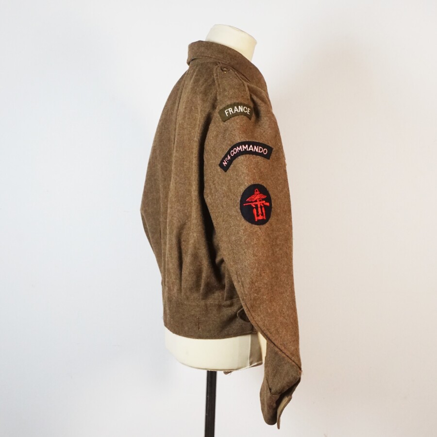 COMMANDO 4 KIEFFER - BATTLE DRESS, en drap laineux kaki, insignes tissu " FRANCE ", " N° 4 COMMANDO " (lettres tirant sur la couleur rose) et OPERATIONS COMBINEES sur chaque manche, Seconde Guerre Mondiale, sans garantie, TBE.