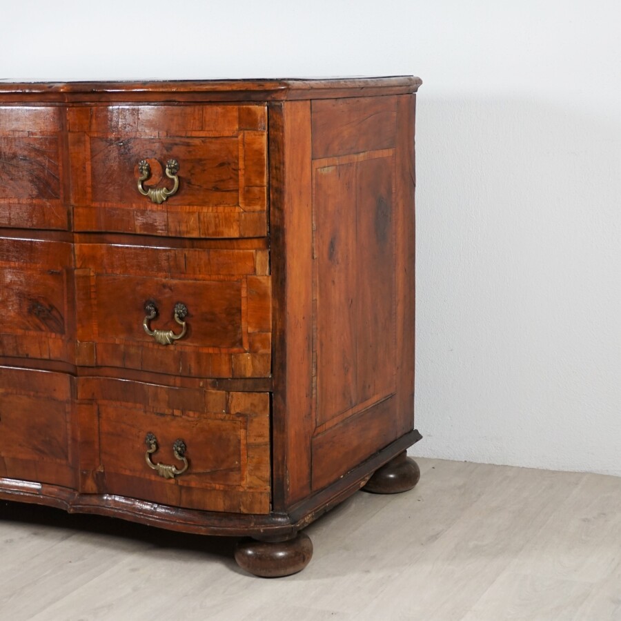 Commode à façade en arbalète en placage de bois exotique ouvrant à trois tiroirs en façade, reposant sur quatre pieds boules, ornementation en métal doré telles que poignées de tirage à motif de coquille et entrées de serrure, seconde moitié du 18e siècle, H. 86.5 cm, L. 129 cm, P. 68 cm (sans clé, une poignée à refixer, quelques manques au placage, usures).