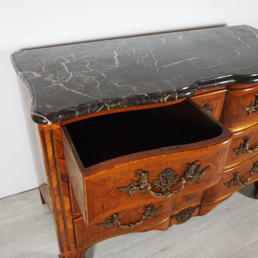 Commode dite arbalète de style Louis XIV, bois de placage ouvrant à quatre tiroirs sur trois rangs, les montants à motif de colonnes cannelées, ornementation de bronzes doré et ciselés à motif feuillagé telle que poignées de tirage, entrée de serrure, sabots et tablier, tampon au dos illisible, fin du 19ème siècle - début 20ème siècle , H. 88 cm. L. Avec marbre : 130.5 cm. P. Avec marbre : 60 cm (quelques usures et rayures d'usage).