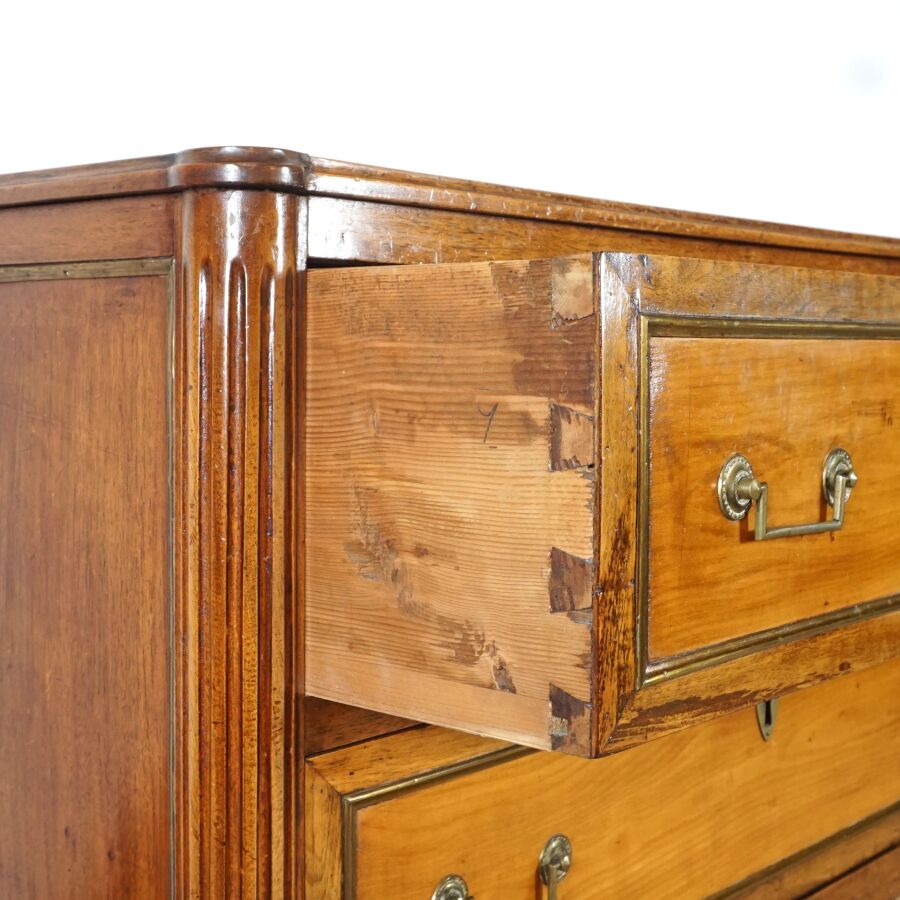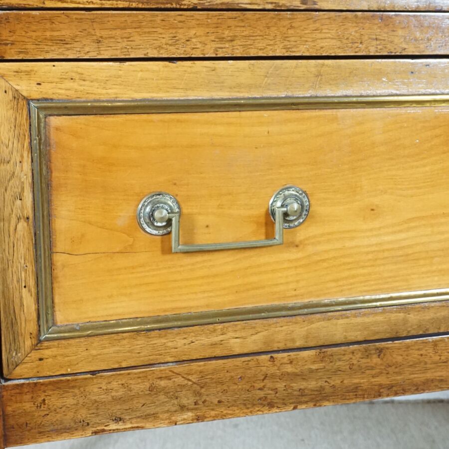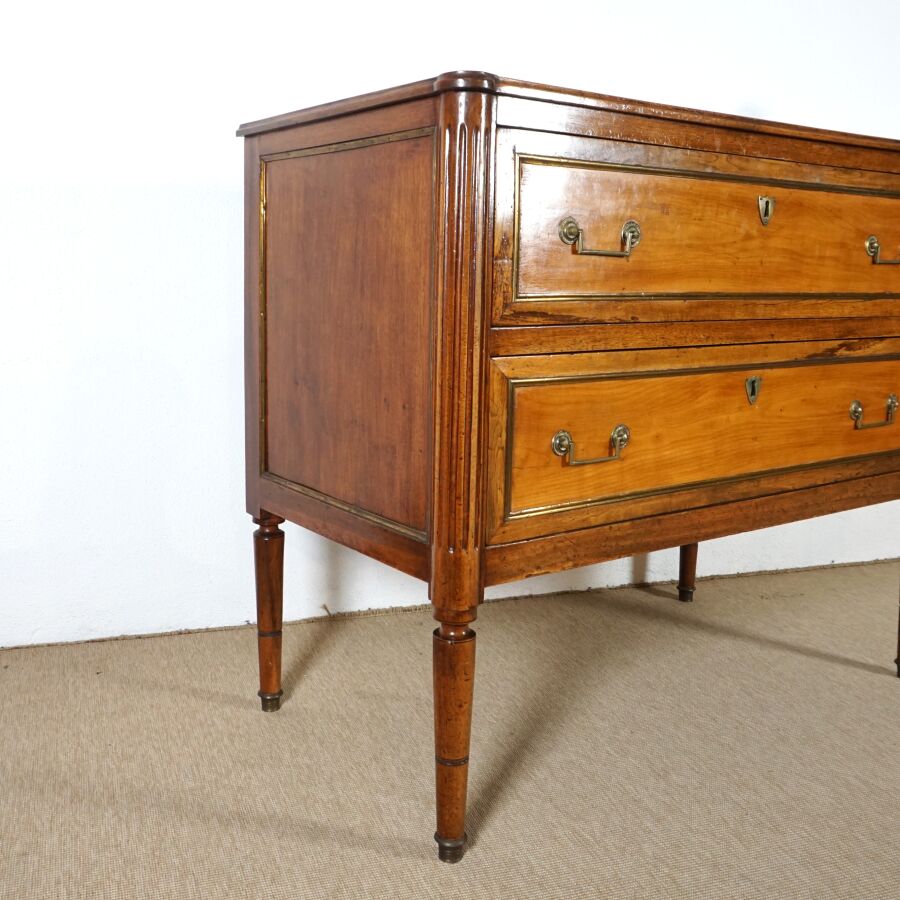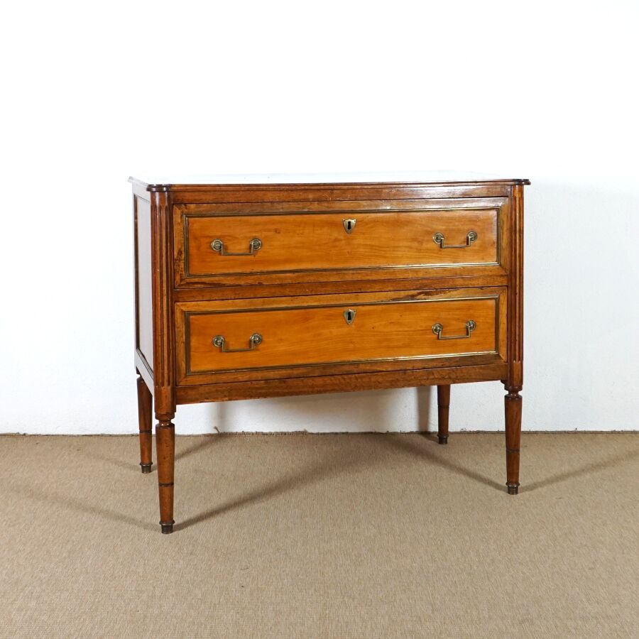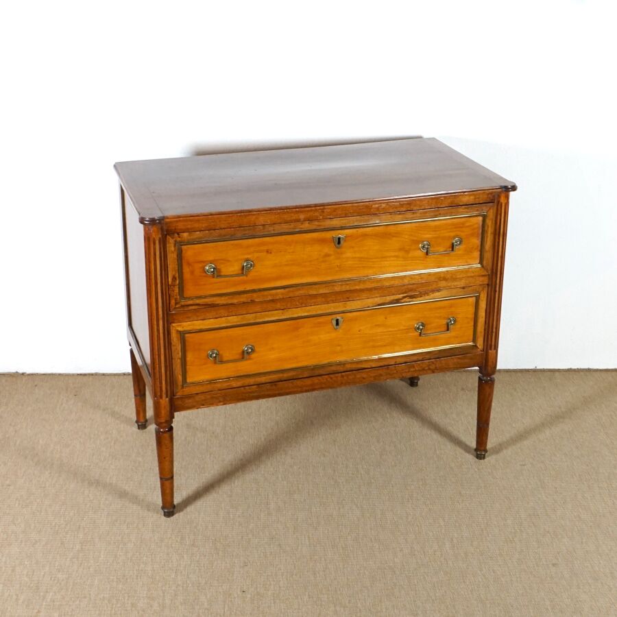 Commode en bois ouvrant en façade à deux tiroirs séparés par une légère traverse, plateau bois, ornementation de laiton doré telle que poignées de tirage, sabots et entrées de serrures, montant cannelé, piétement fuselé, travail de style Louis XVI, Dim. 90 x 104.8 x 54.7 cm (avec clé, usures et traces).