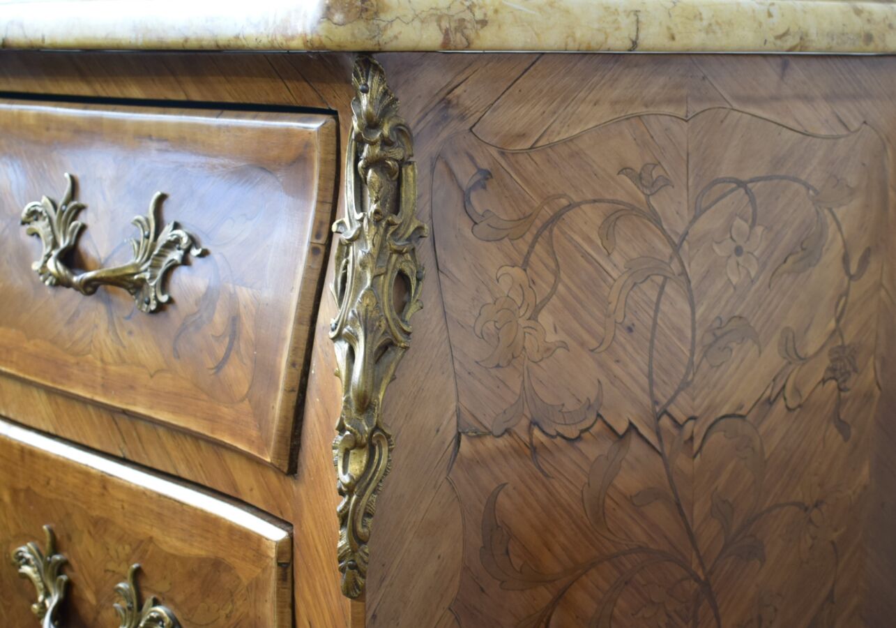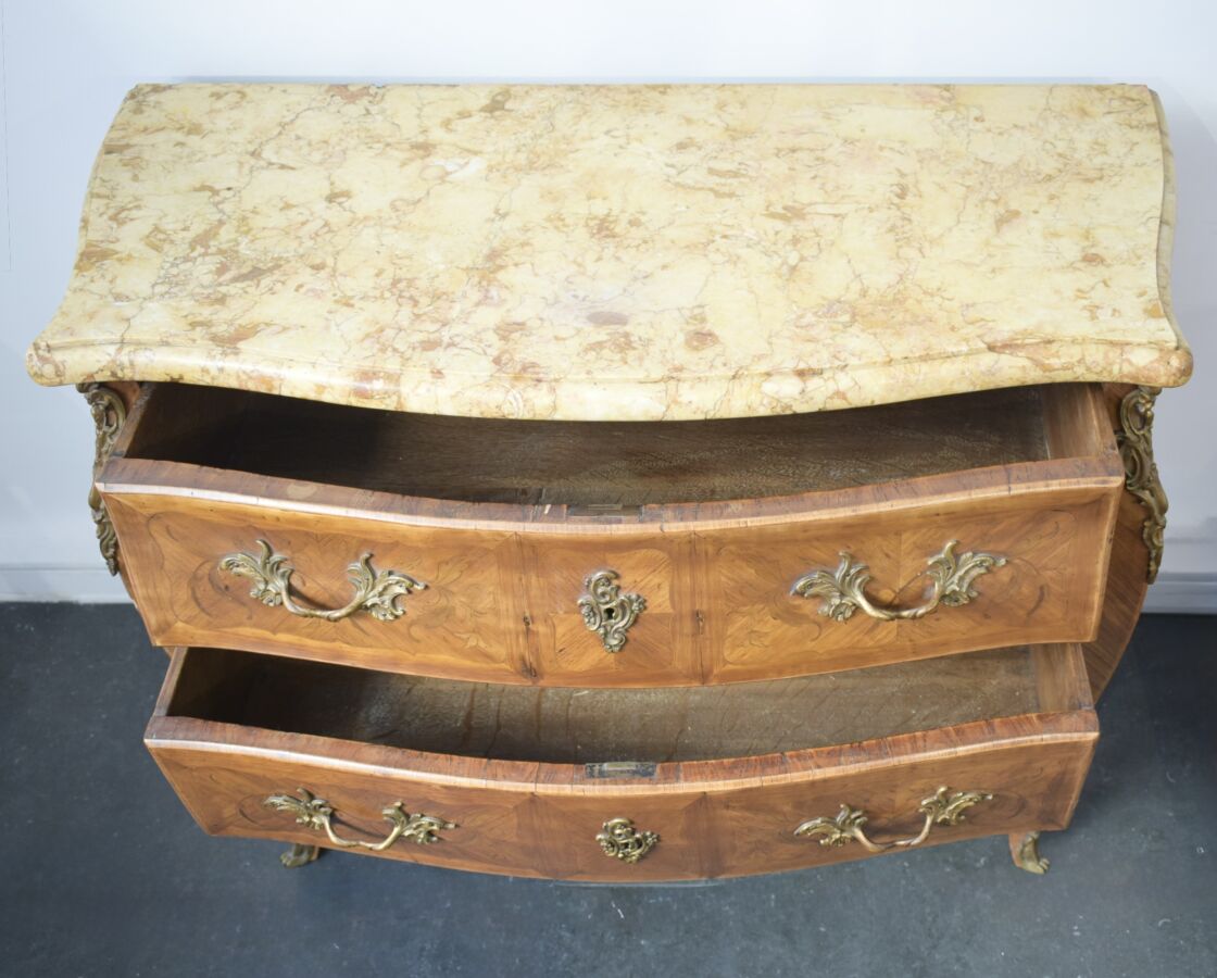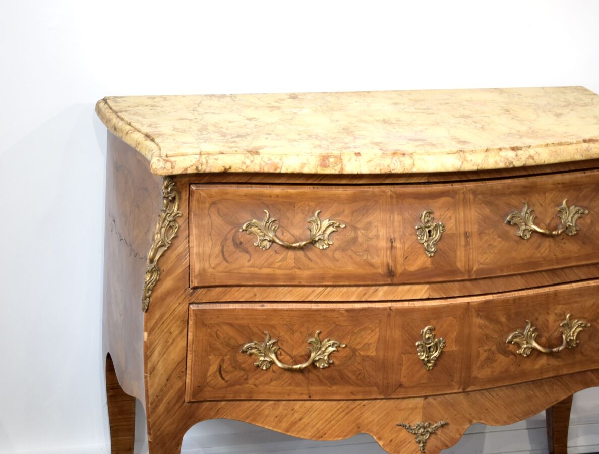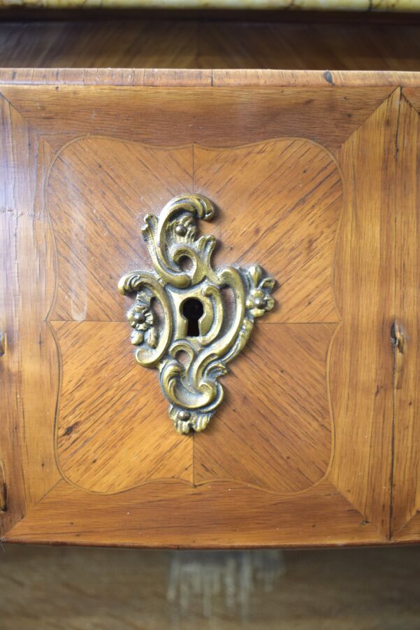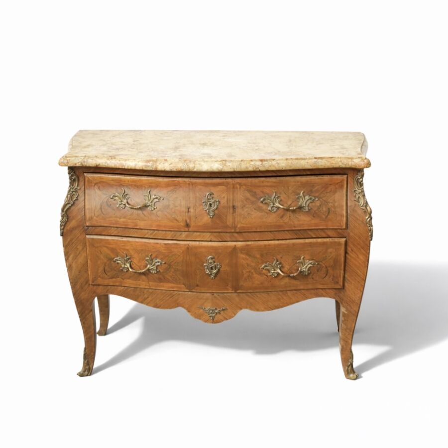 Commode galbée de style Louis XV surmontée d'un plateau en marbre mouluré, le placage à décor marqueté ouvrant par trois tiroirs, décorée d'une riche ornementation de bronzes dorés à décor rocaille. 84 x 102 x 46 cm. (usures d'usage, traces sur le marbre)