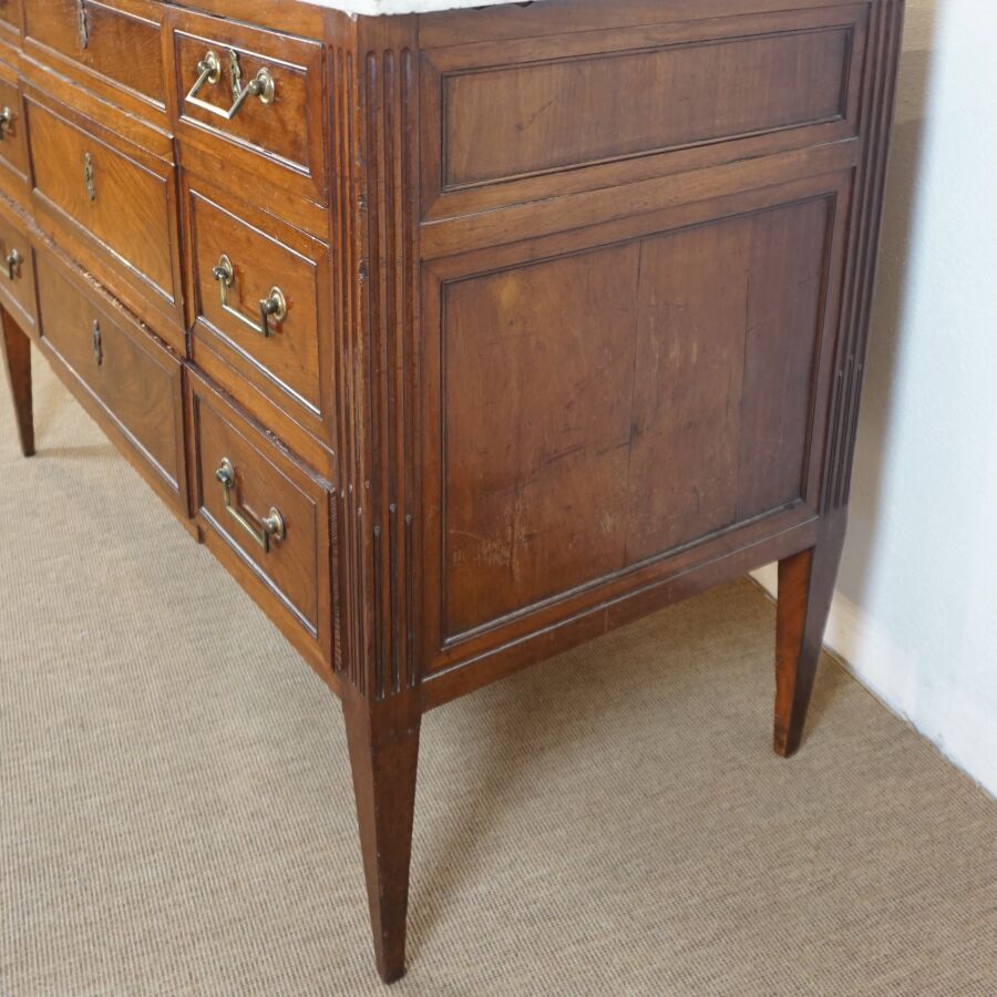 Commode Louis XVI, en bois et placage d'acajou, ouvrant en façade à trois tiroirs, montants cannelés et fuselés, piètement gaine, coiffée d'un de marbre blanc, fin du 18ème siècle - début du 19ème siècle, H. 92 cm, L. 128,5 cm, Larg. 62 cm (avec sa clé, restaurations au marbre, petites usures légères).