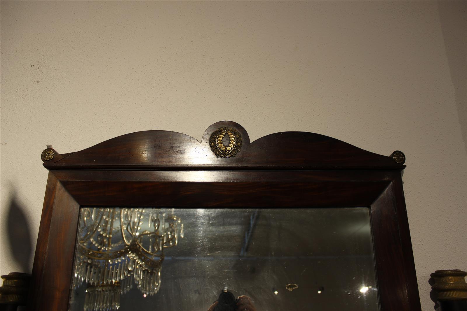 Commode psyché à colonnes détachées, en acajou et placage d'acajou, ouvrant à un tiroir, dont un découvrant un écritoire, elle est surmontée d'un gradin ouvrant à deux tiroirs et d'un miroir, 111 x 60 x H. 94 cm, dim. du miroir : 81 x 118 cm (accidents, restauration et remontages, le miroir et les colonnes ne sont plus fixés à la partie basse)