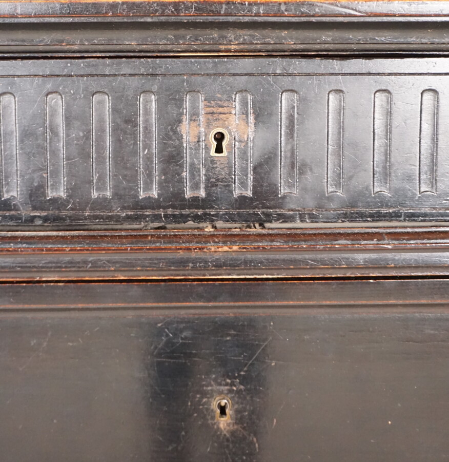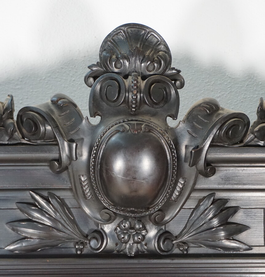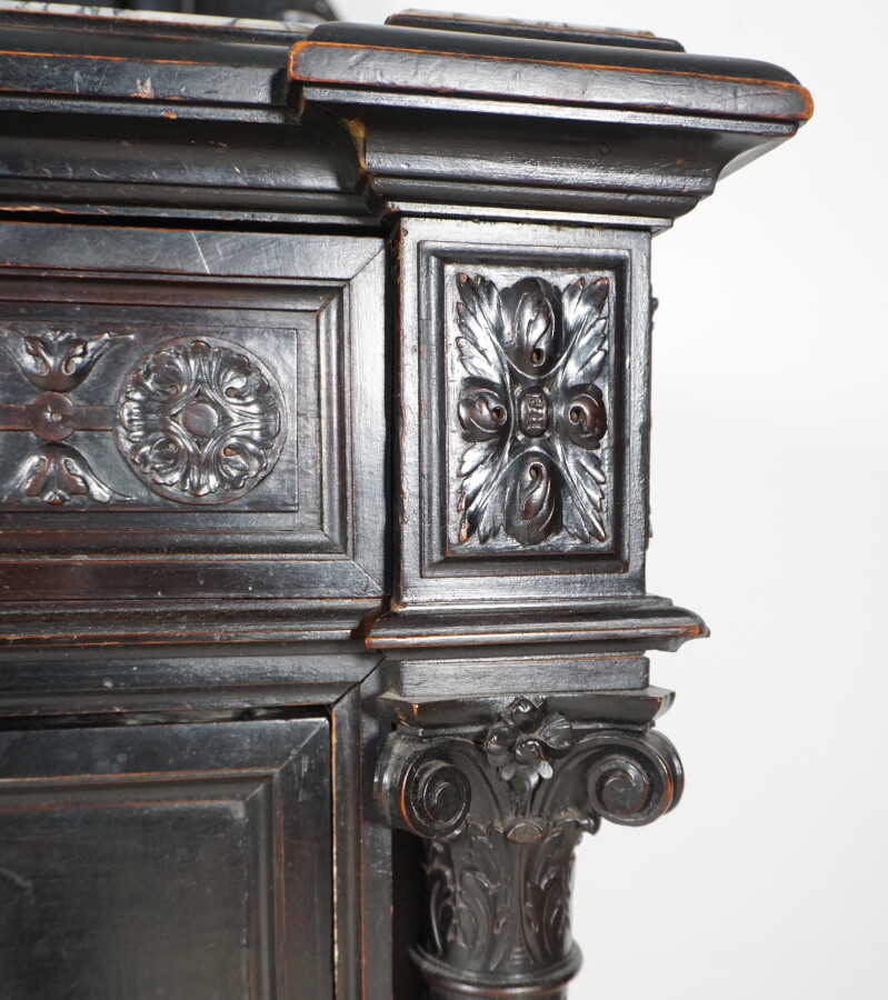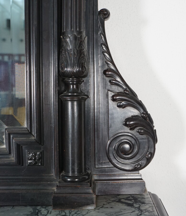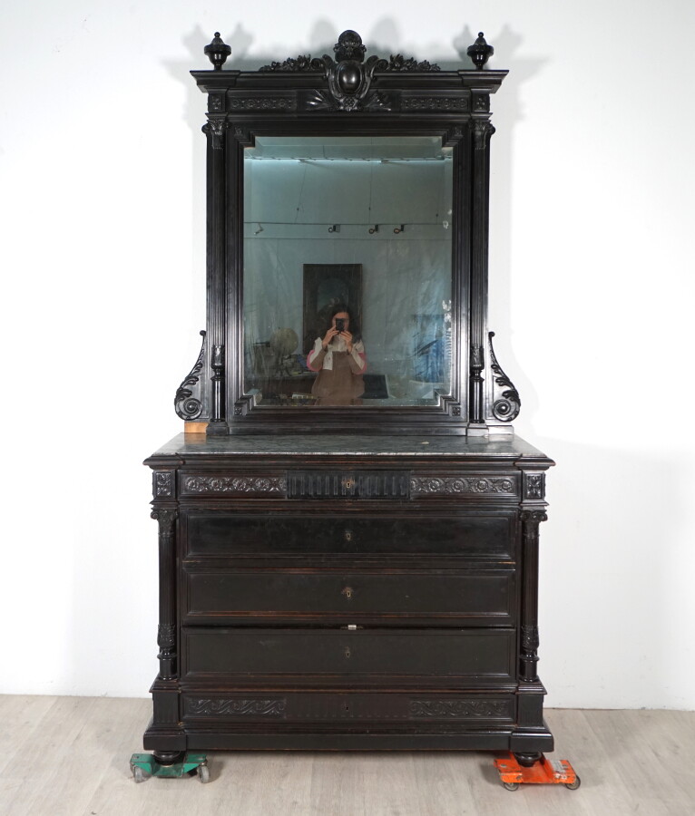 Commode-psyché en placage poirier noirci mouluré et sculpté, la partie basse ouvrant en façade à trois tiroirs encadrée de colonnes ornées de chapiteaux corinthiens à motif de feuilles d'acanthe, surmontée d'un marbre gris veiné blanc et d'une psyché richement ornée d'enroulements, d'un écu, volutes et feuillages à l'amortissement, H. 246.5 x 129 x 53 cm (petits manques et quelques usures).