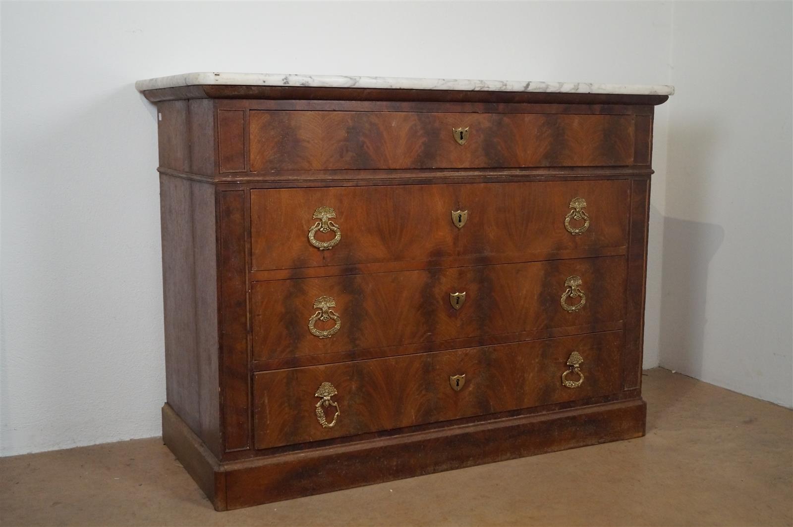 Commode style Empire en acajou et placage d'acajou à motif flammé, elle ouvre à 4 tiroirs sur 4 rangs, poignées de tirage en bronze doré et ciselé à décor de palmettes et de col de cygne, plateau de marbre blanc veiné de gris, seconde moitié du 19e siècle, 118 x 54 x H. 87 cm (marbre probablement rapporté, une poignée à refixer, petites rayures d'usage))