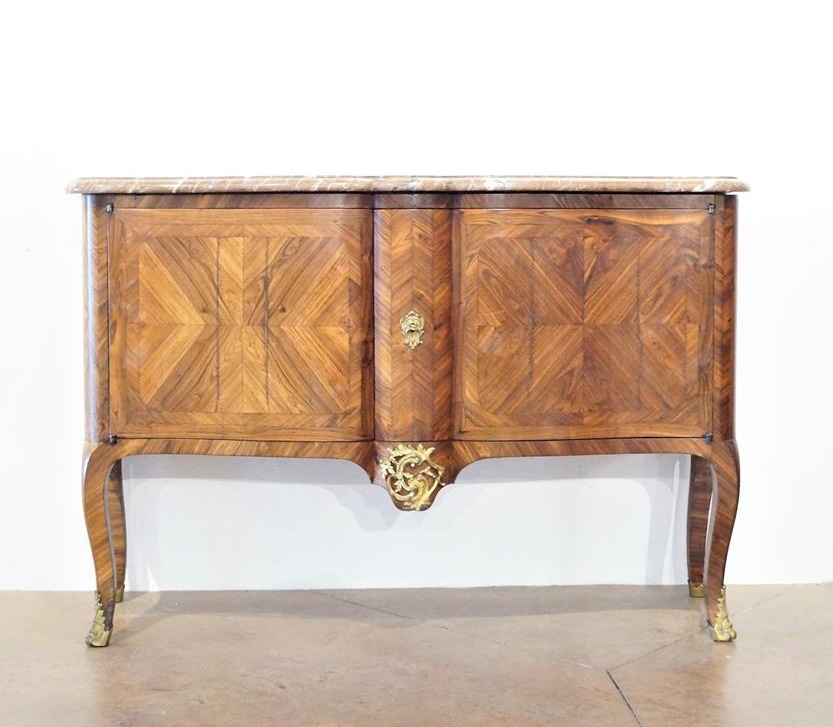 Commode style Transition de forme arbalète en bois de placage ouvrant en façade à deux vantaux et reposant sur quatre pieds hauts cambrés, plateau de marbre veiné rouge, 122 x 46 x H. 82 cm (avec une clé).