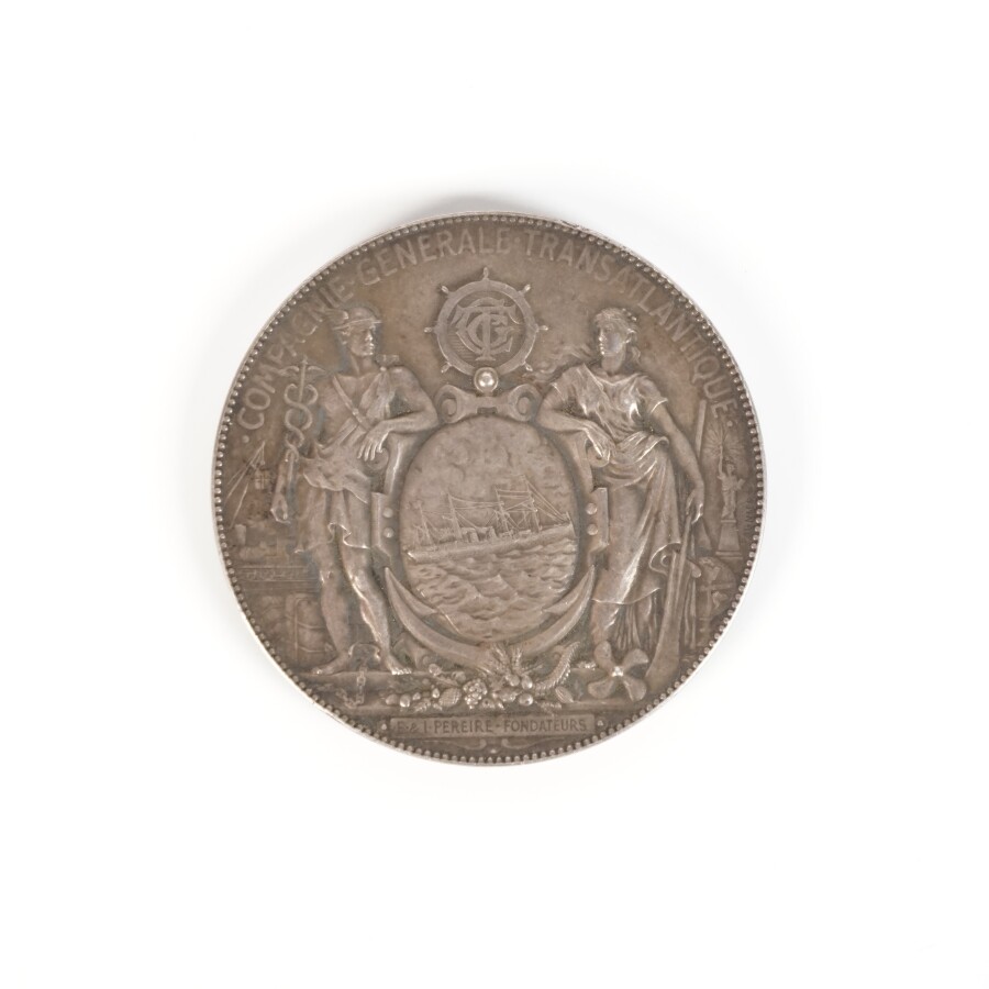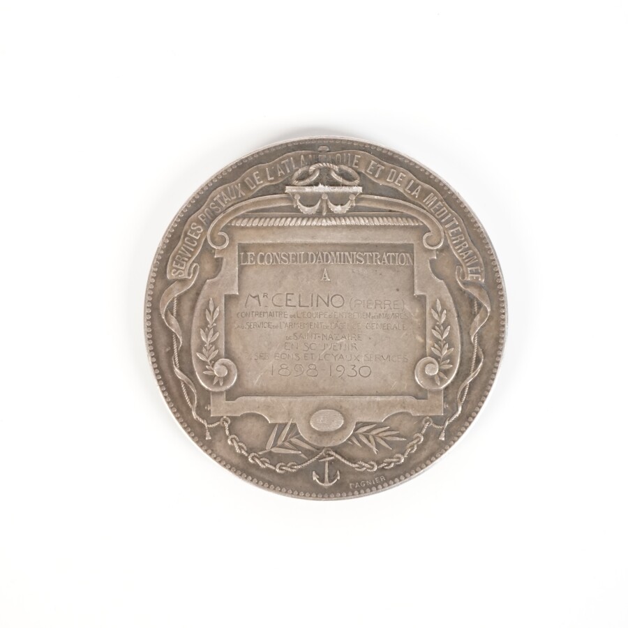Compagnie générale Transatlantique, Perreire fondateur : Médaille en métal pour le service rendu par Monsieur CELINO contremaître de l'armement général de Saint-Nazaire, bronze argenté ciselé, 1898 - 1930, D. 6.8 cm.
