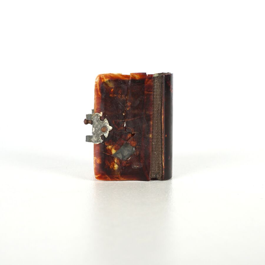 En l'état avec plusieurs manques. Folios très fragiles et s'effritant, certains manquants, reliure accidentée et consolidée, fermoir incomplet et oxydé, taches et petites déchirures, loupe détachée.