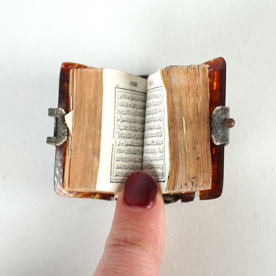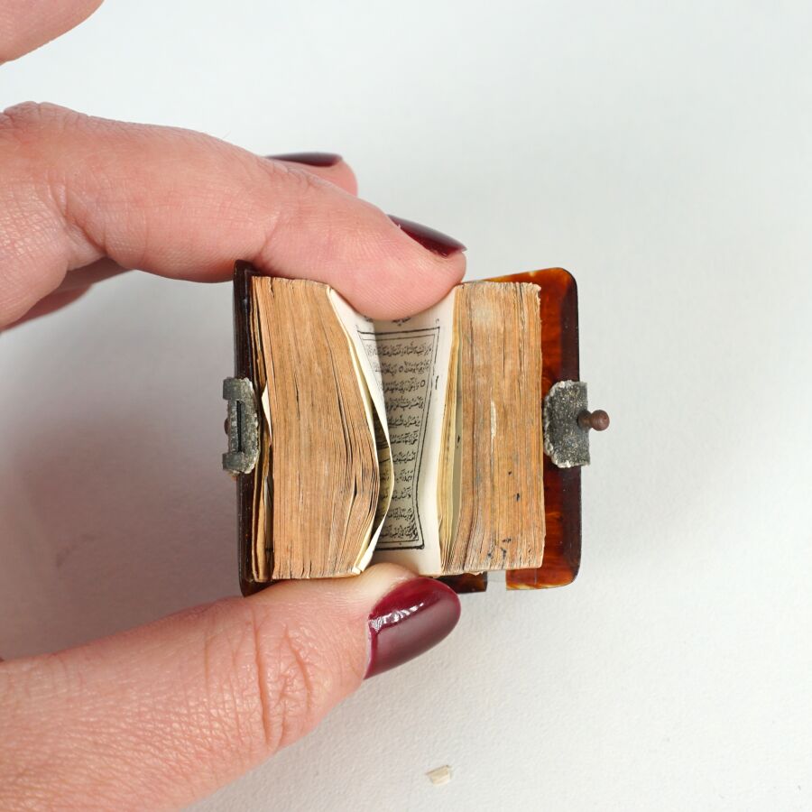 Petit Coran sur papier de 819 pages numérotées, imprimé en arabe d'un texte de 11 lignes par page en calligraphie naskhi. Introduit par un double-frontispice en unwâns coiffé de lambrequins et dans lequel le texte est encadré de cartouches titrés et entouré d'une riche marge florale. Au fil du texte, titres de sourates inscrits dans des cartouches à décor floral, versets séparés par des cercles et divisions du texte marquées par quelques médaillons marginaux. Le texte coranique suivi d'une prière mentionnant à la fin le Sheikh 'Ali al-Qârî et la date de 1097 H / 1685. S'ensuit un sommaire listant les sourates qui précède le colophon donnant, dans des cartouches rectangulaires sur fond floral, la date et le lieu d'impression au mois de Ramadan 1304 H / mai 1887 à la Matbaa-i Osmaniyye (Les Presses ottomanes). Reliure composée de plats en celluloïde à petit fermoir métallique et d'un dos en textile, les pages de garde à décor peint de rinceaux. Avec sa petite loupe de lecture.