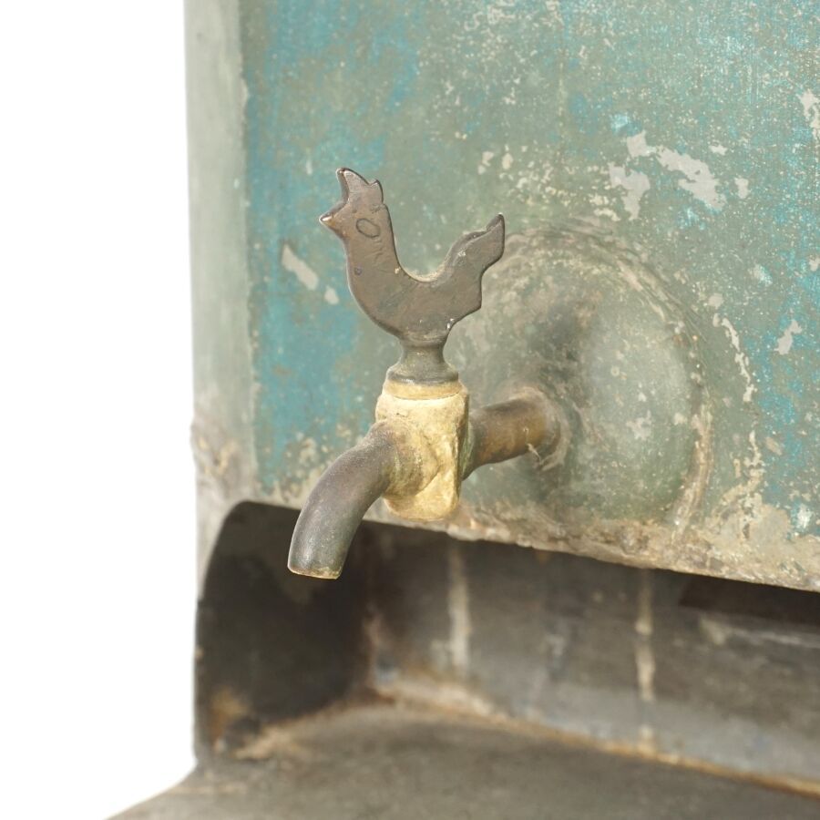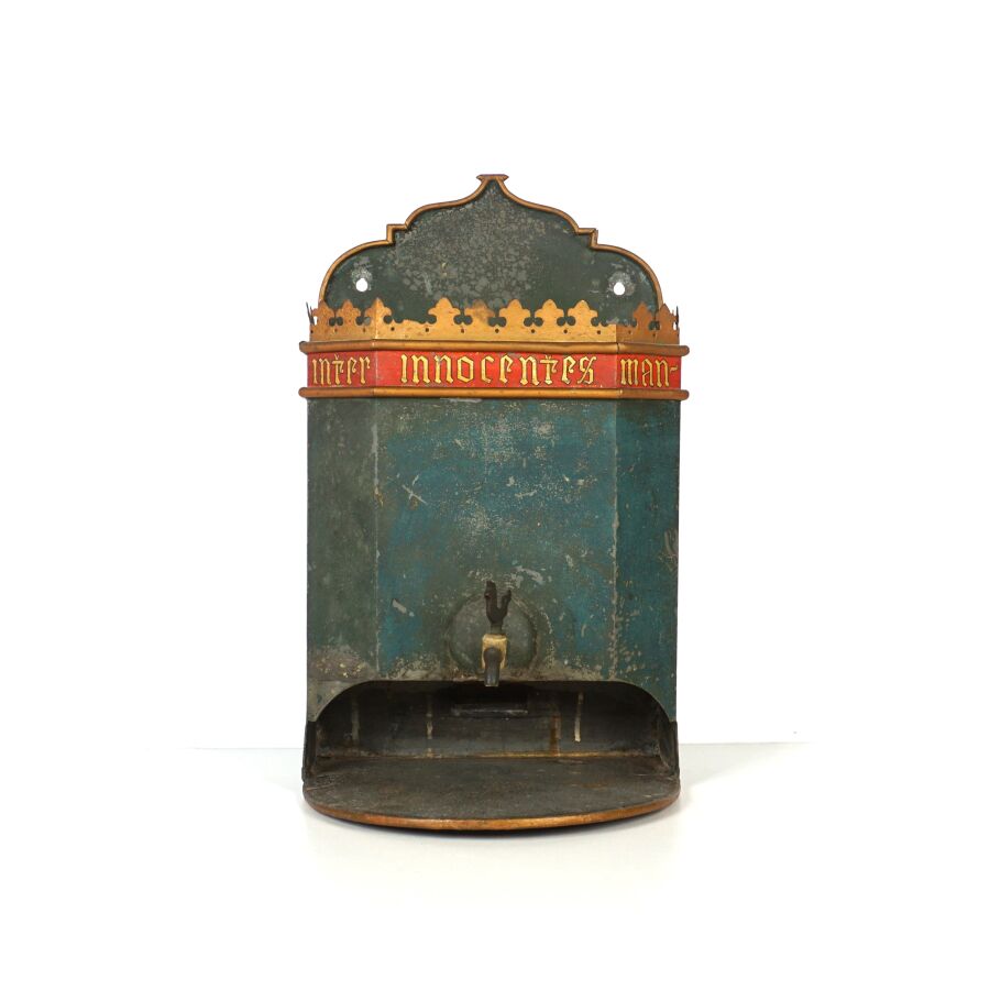 Corps de fontaine en taule peinte en vert, portant un phylactère rouge, milieu du 19ème siècle, H. 37 cm (usures, écaillures).