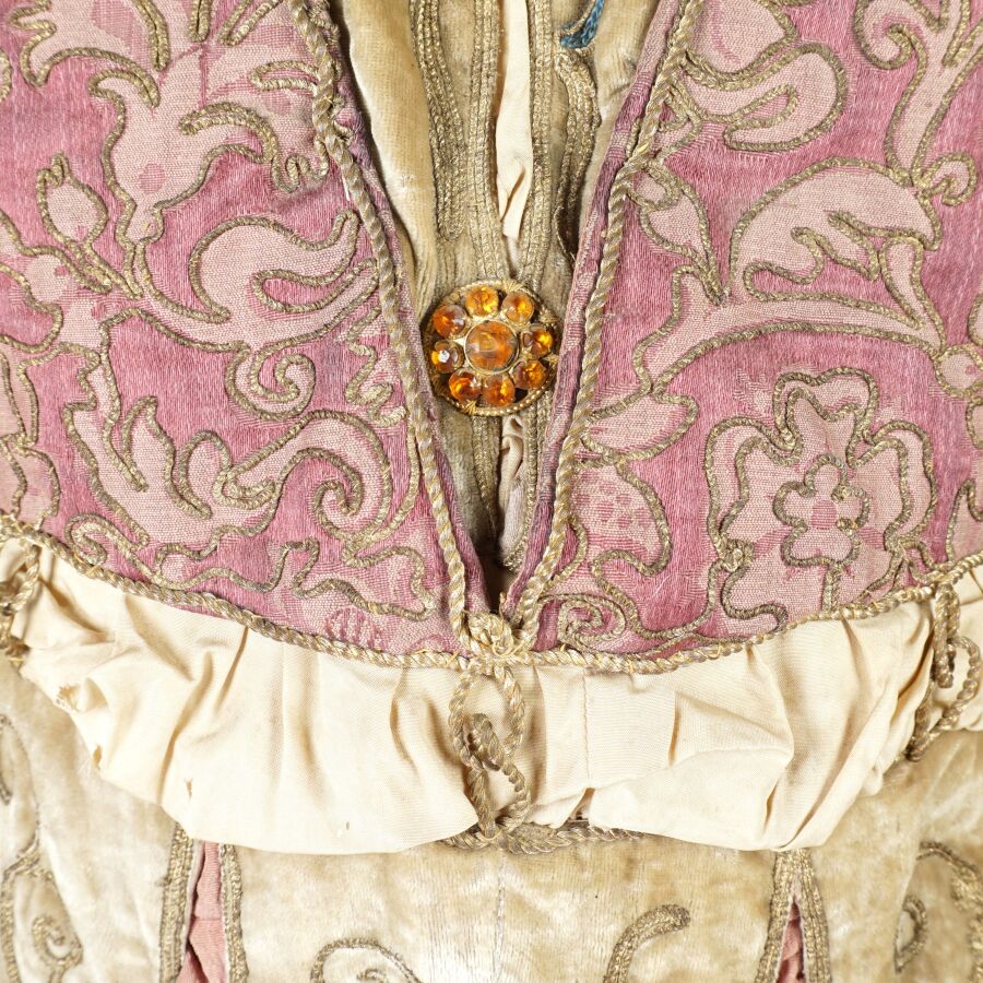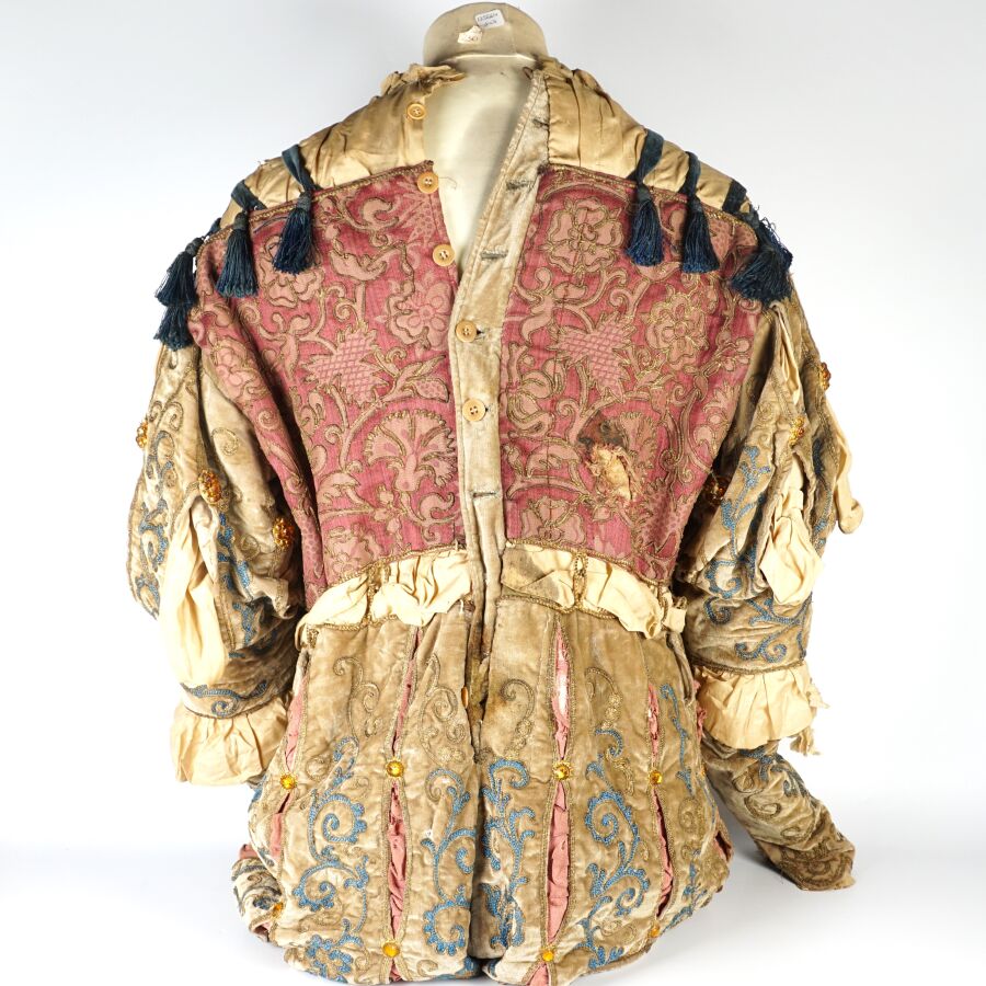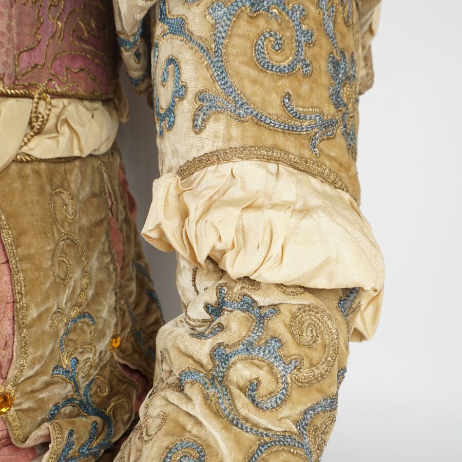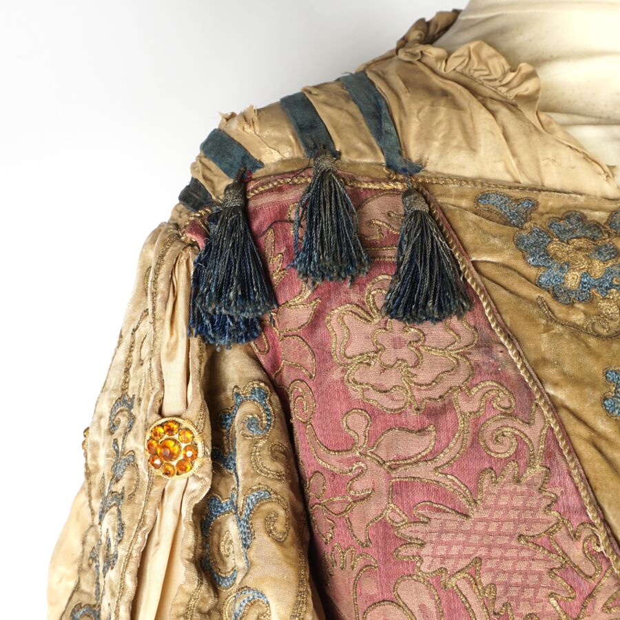 Costume de théâtre à décor brodés de feuillages et arabesques, dans l'esprit de la Renaissance (en l'état, tâches, déchirures).