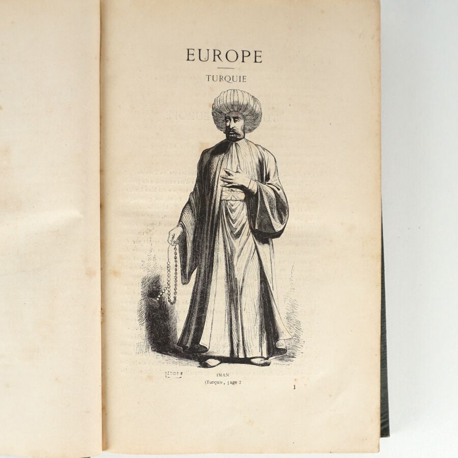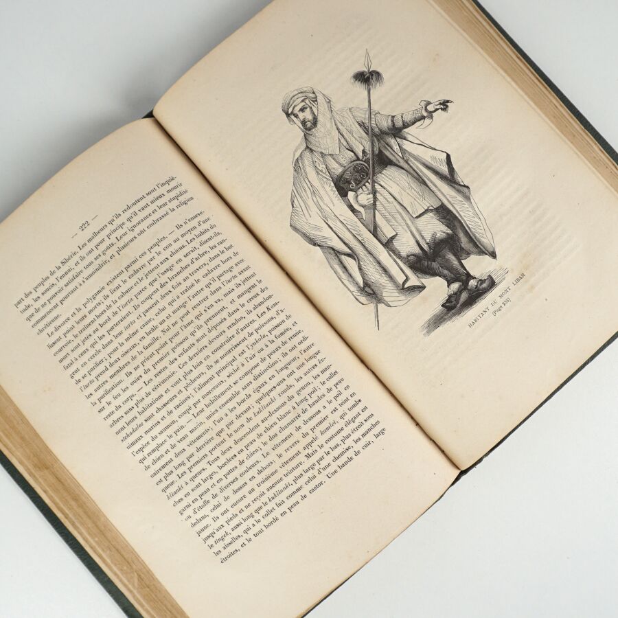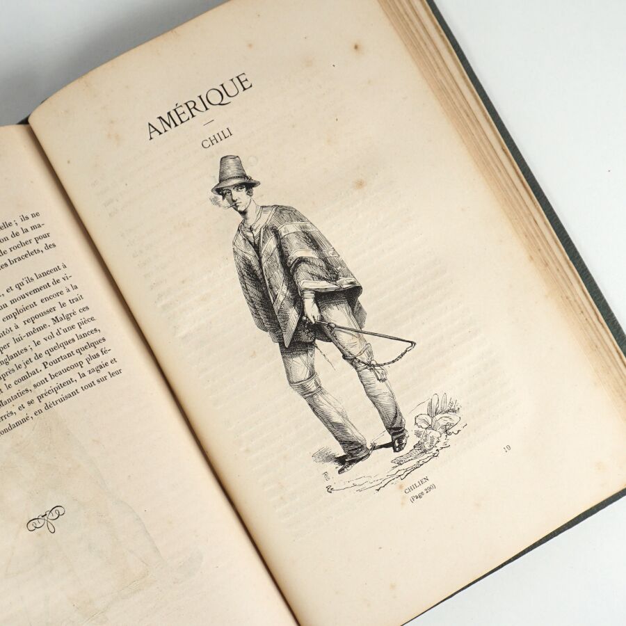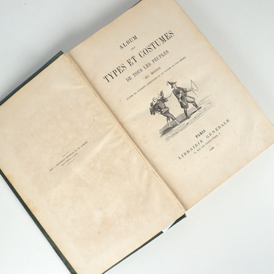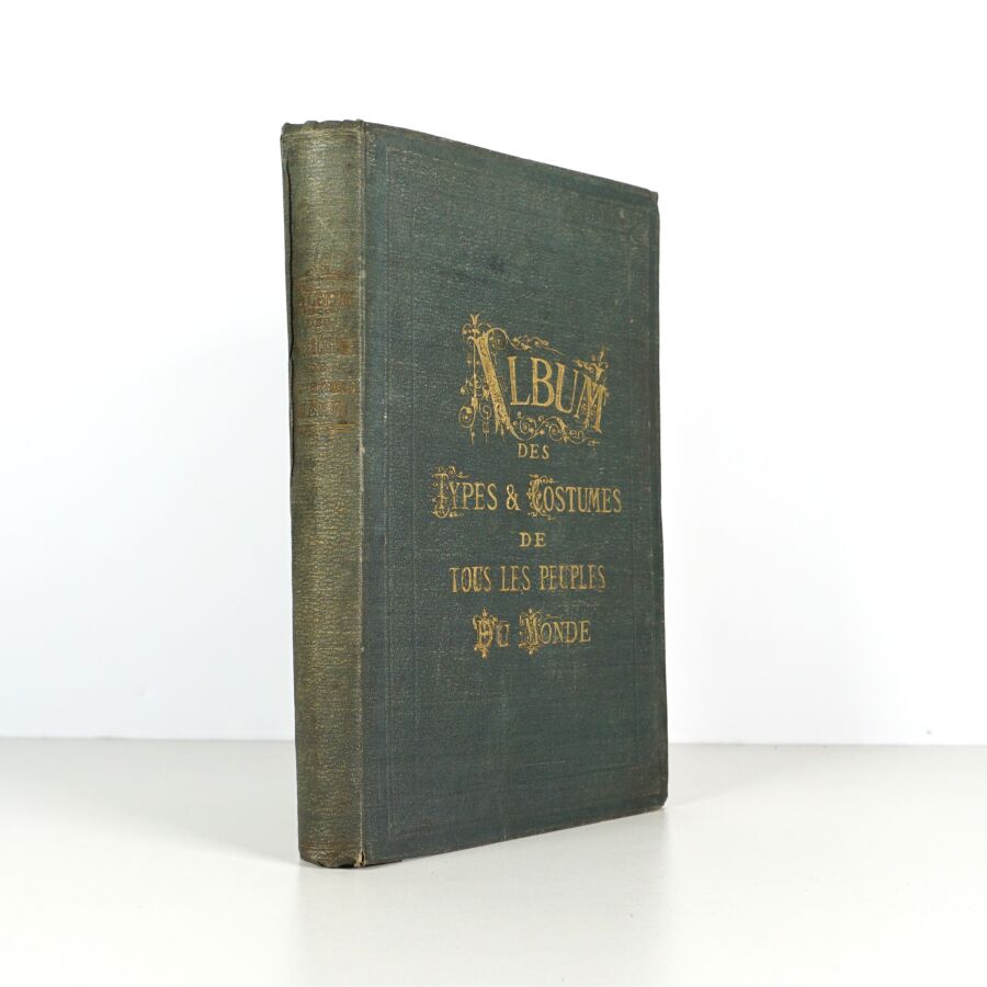 [Costumes du monde]. Album des types et costumes de tous les peuples du monde. Paris, Librairie générale, 1869. Grand in-8 percaline verte, titre doré au dos et sur le plat supérieur (reliure de l'époque). Dos passé, quelques rousseurs, reliure un peu défraîchie.