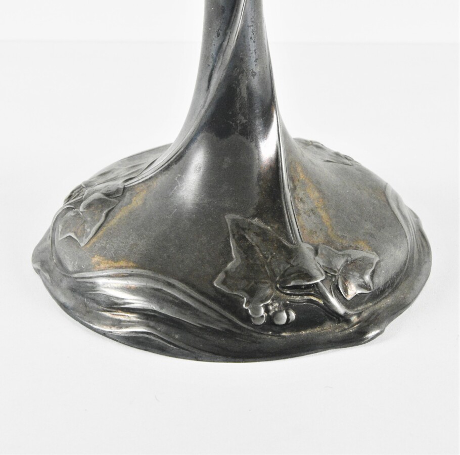 Coupe circulaire sur piédouche Art-Nouveau, en métal argenté à décor ajouré de branches de gui, H. 25 cm, D. 27 cm (petites usures, désargenté).