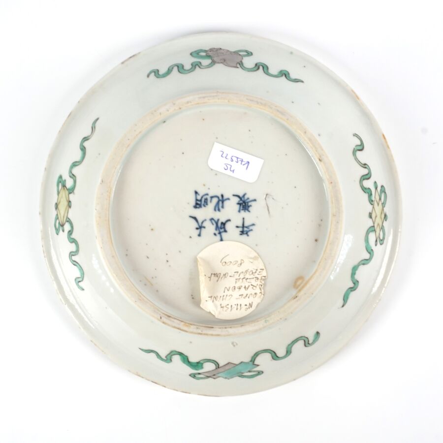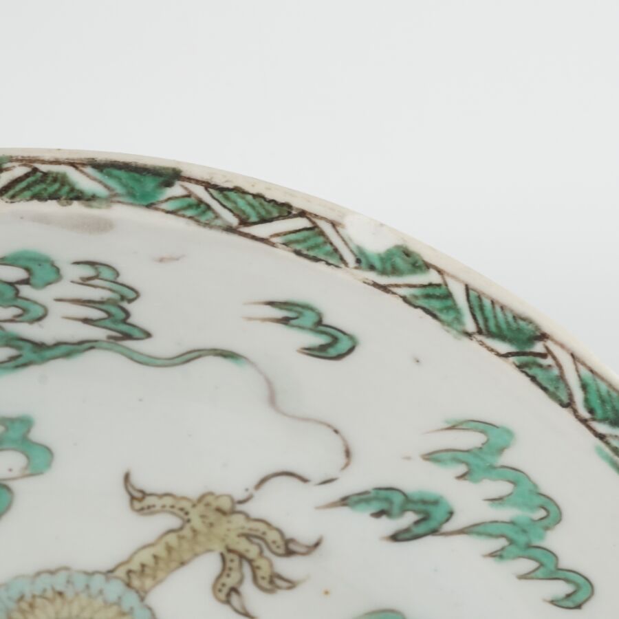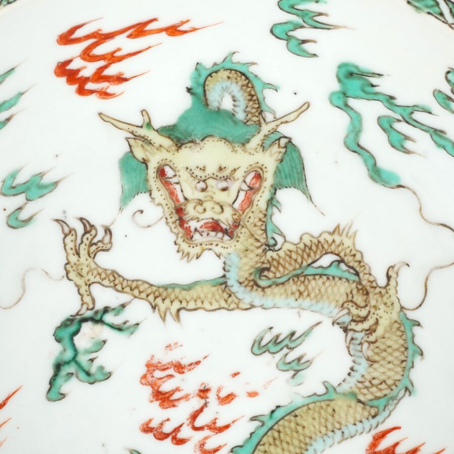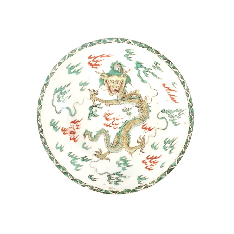 Coupe creuse en porcelaine et émaux de la famille verte, à décor d'un dragon déployé autour du joyau sacré, parmi des nuées, marque apocryphe Chenghua au revers, Chine, 18ème siècle, D. 16,6 cm (infime éclat en bordure et au talon).