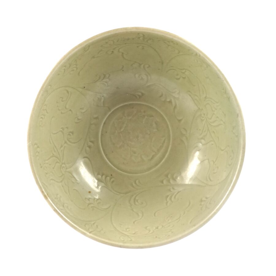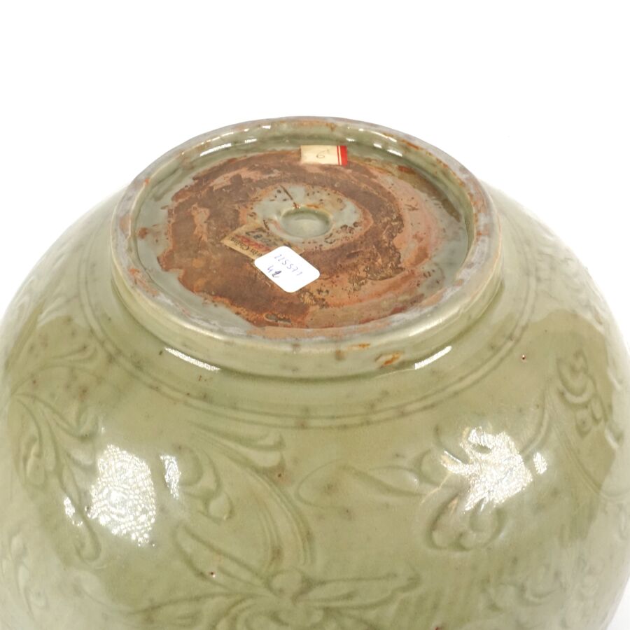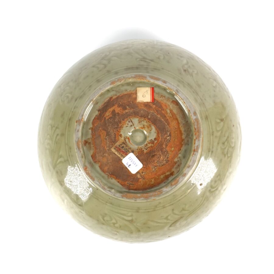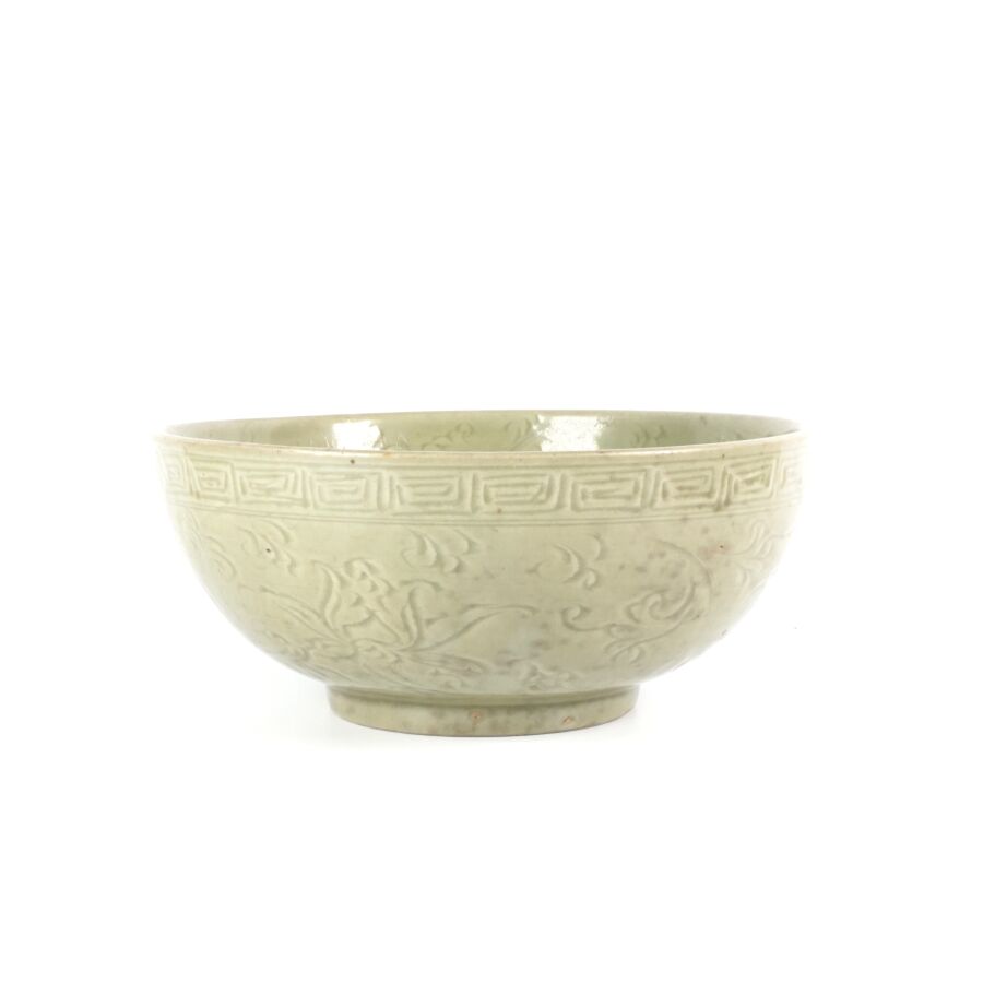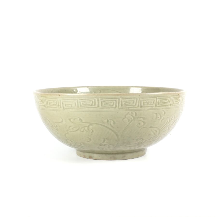Coupe émaillée céladon, à décor incisé sous couverte de motifs floraux, une frise de grecques sur le pourtour complète l'ornementation du col, four de Longquan, Chine, période Ming présentée sur un socle circulaire en bois, H. 13.5 cm, D. Col : 28.1 cm. Diam. Totale : 35.5 cm.