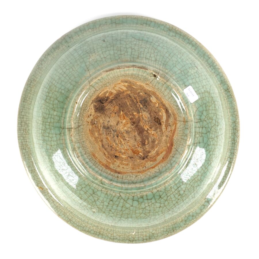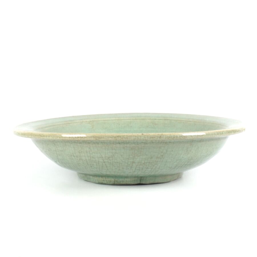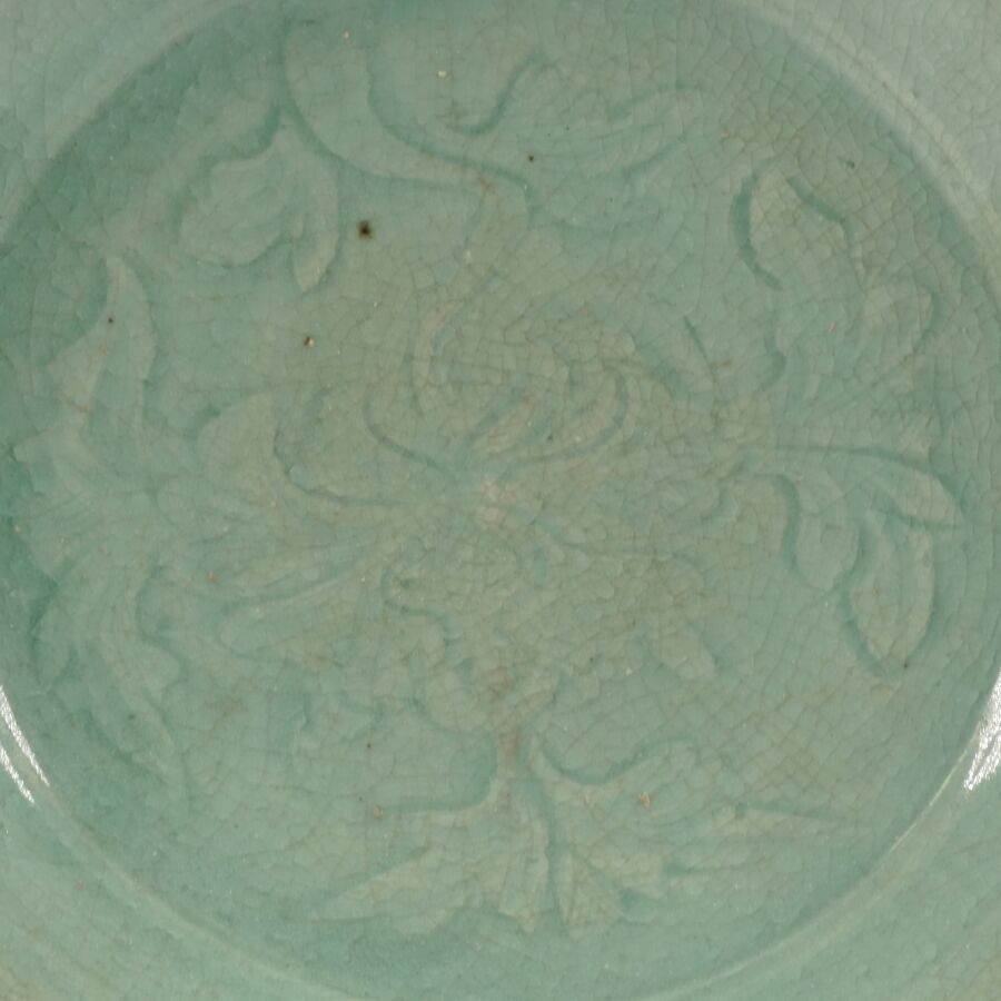 Coupe en grès émaillé céladon à décor incisé sous couverte de fleurs, Chine, 19ème siècle, H. 8.7 cm. D. 36,7 cm.