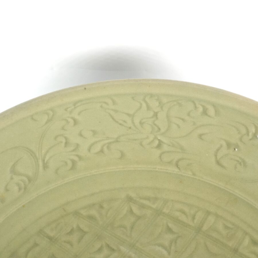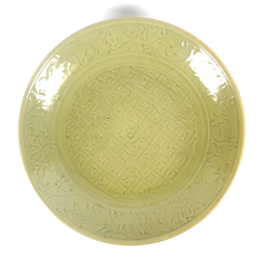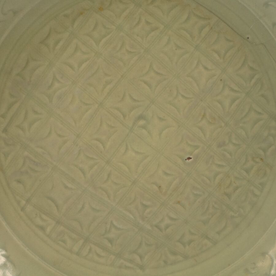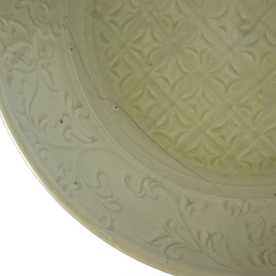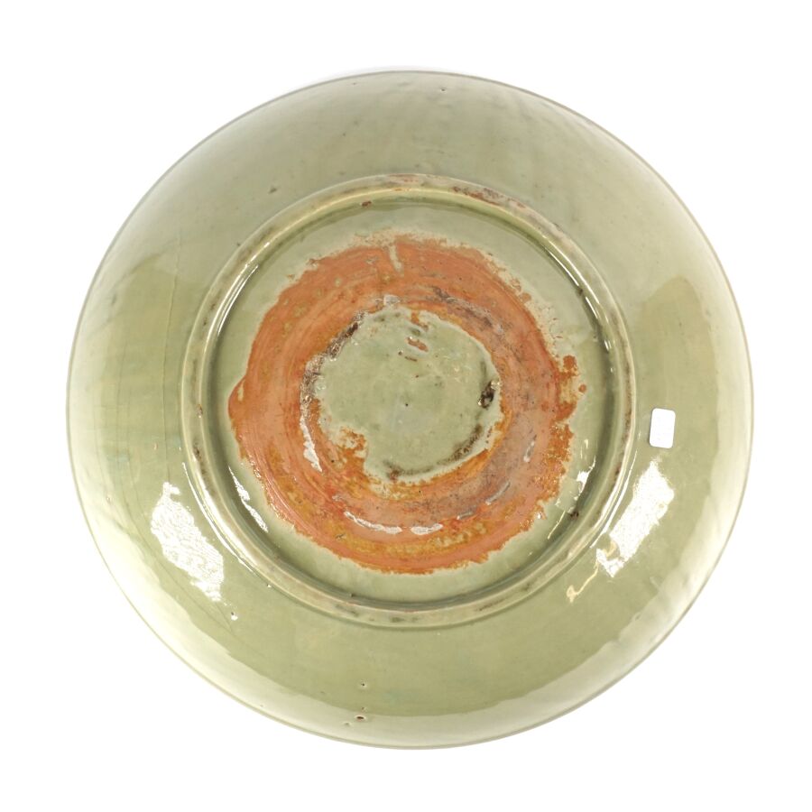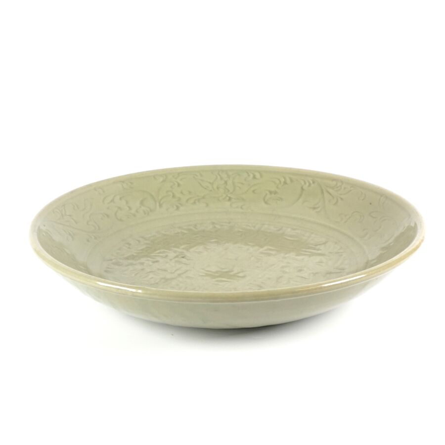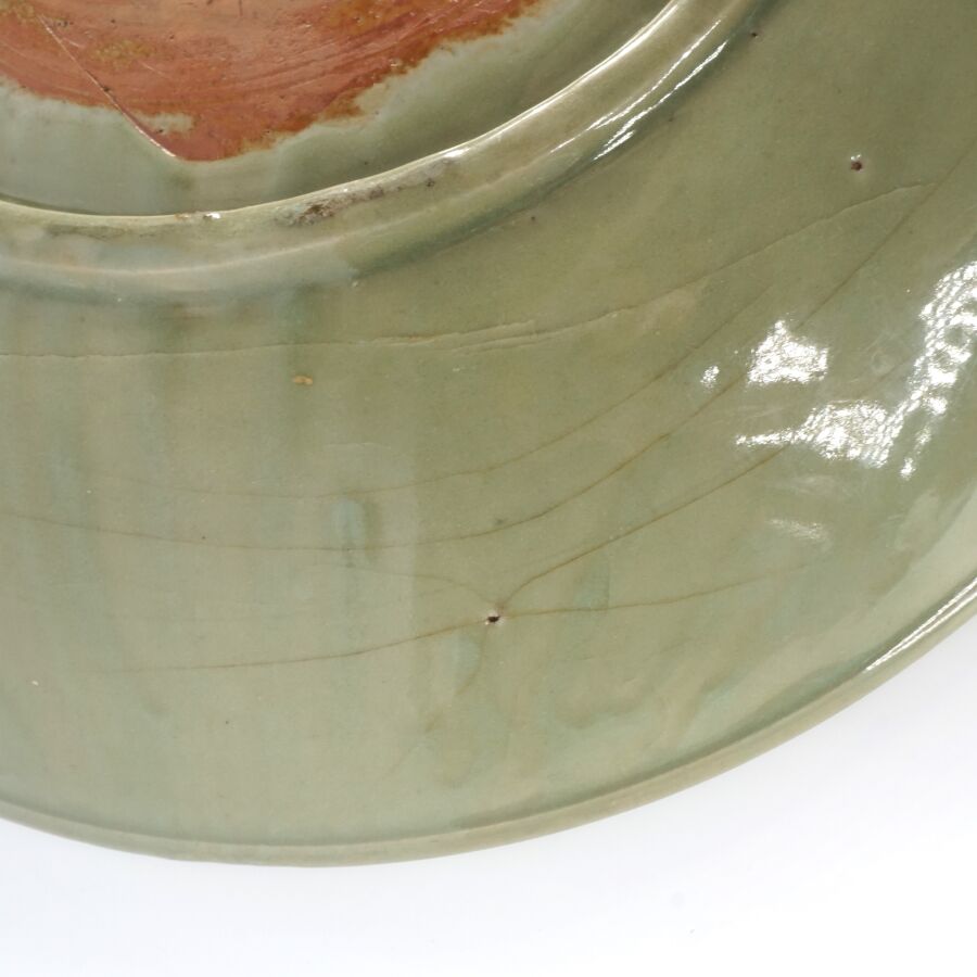 Coupe en grès émaillé céladon, Chine, 18ème-19ème siècle, H. 9 cm. D. 46 cm (restauration).