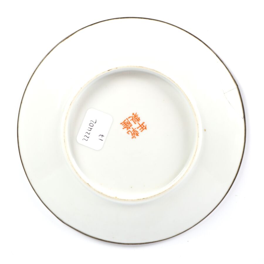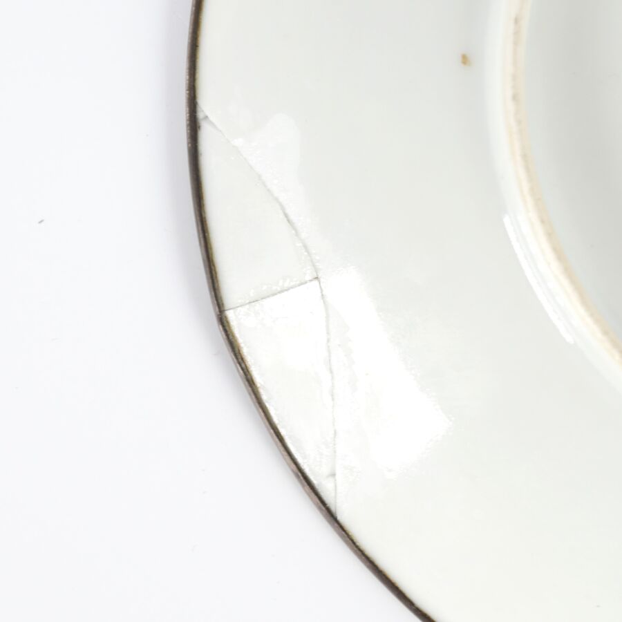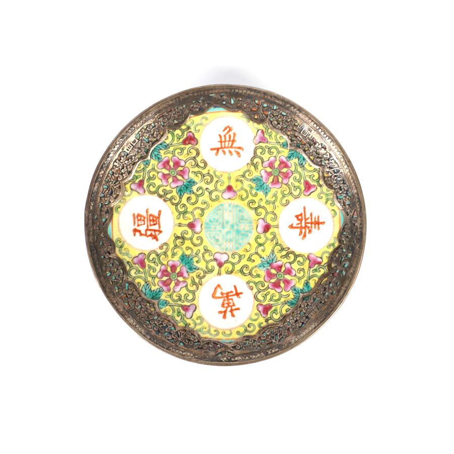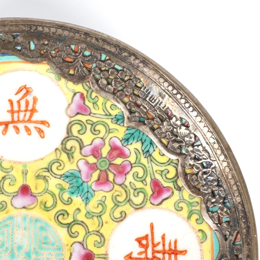 Coupe en porcelaine et émaux de style famille rose à décor sur fond jaune de rinceaux et de motifs calligraphiés en réserve, monture en métal argenté (Vietnam), Chine fin du 19ème siècle, D. 14 cm (restauration).