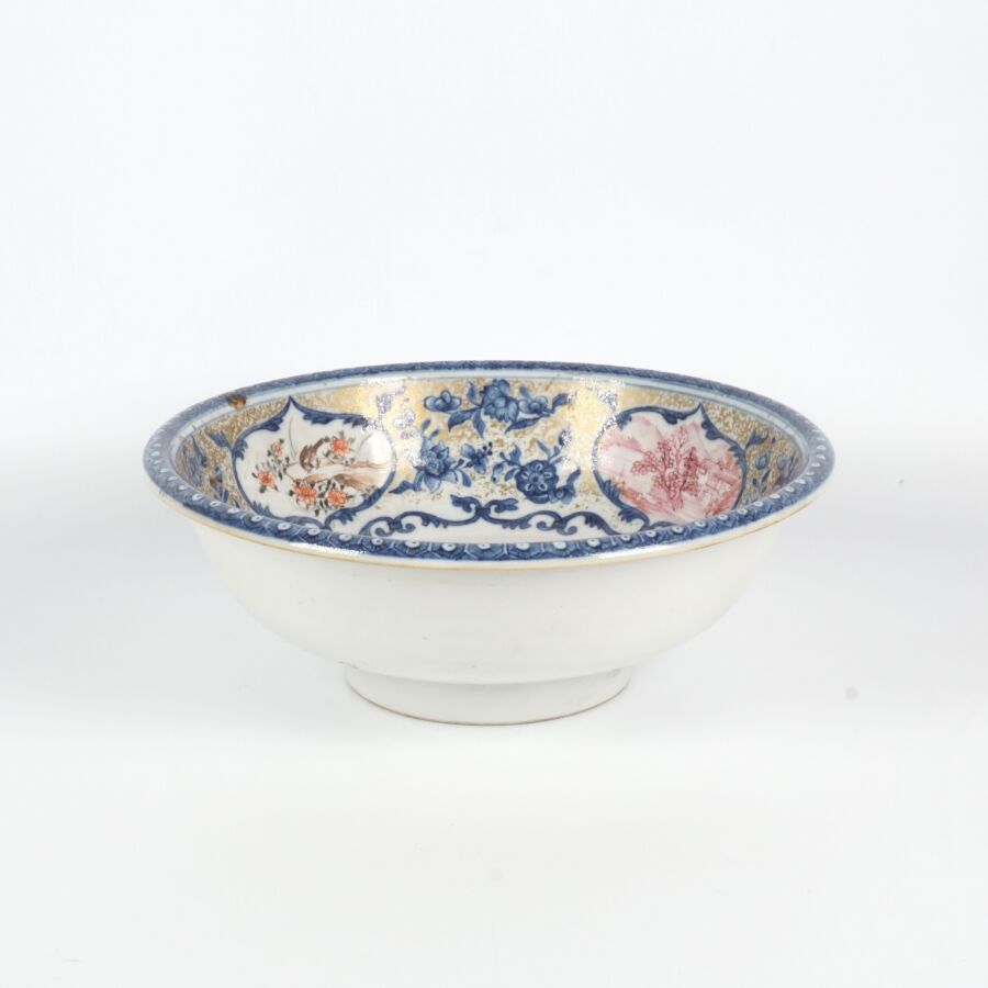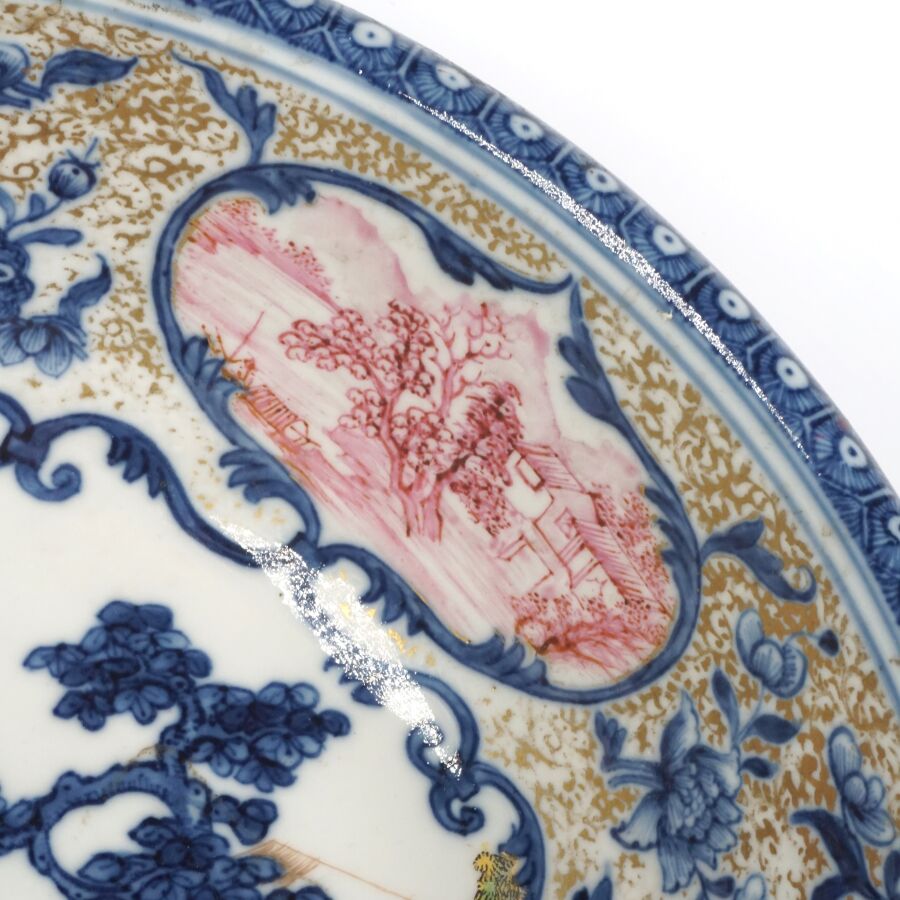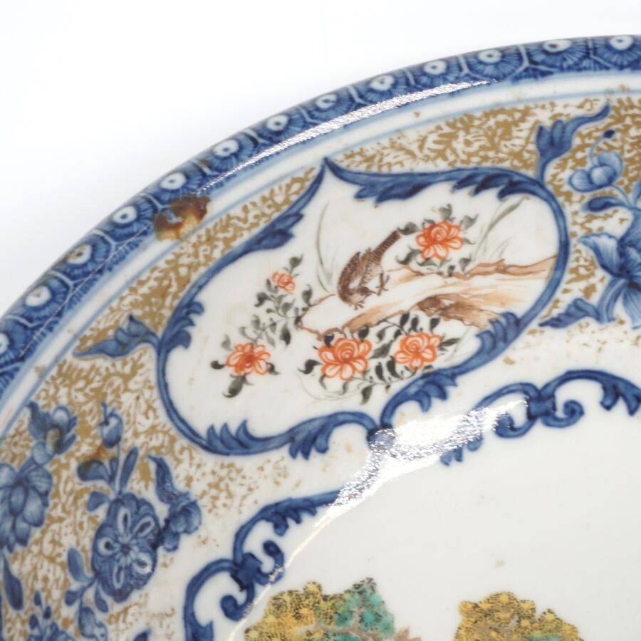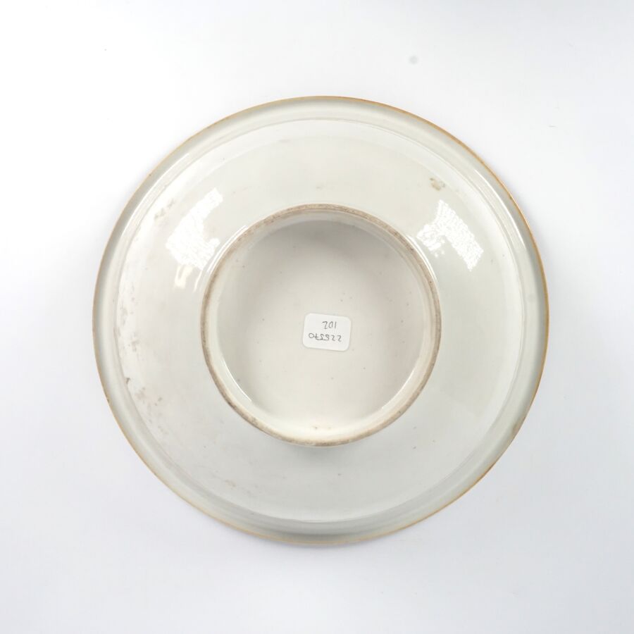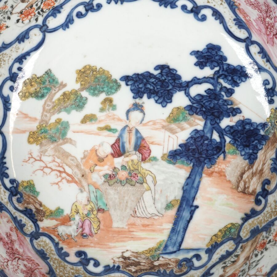 Coupe en porcelaine et émaux polychromes et dans le goût des palettes de mandarins, à décor en médaillon central de personnages sur une terrasse arborée, l'aile ornée en réserve d'oiseaux et jardins, Chine, fin du 18ème - début du 19ème siècle, D. 25.5 cm. H. 9.3 cm.