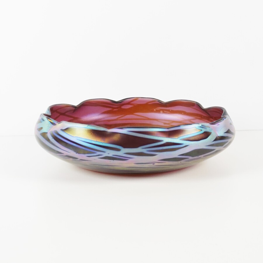 Coupe en verre, bord chantourné, fond irisé, Diam : 25 cm.