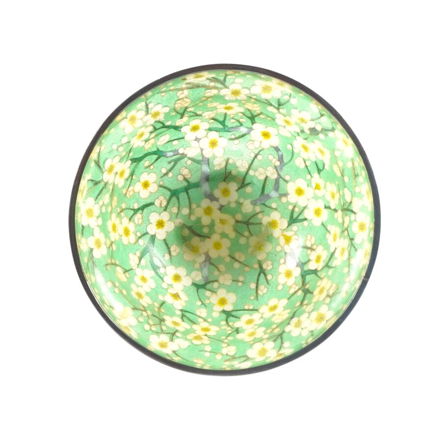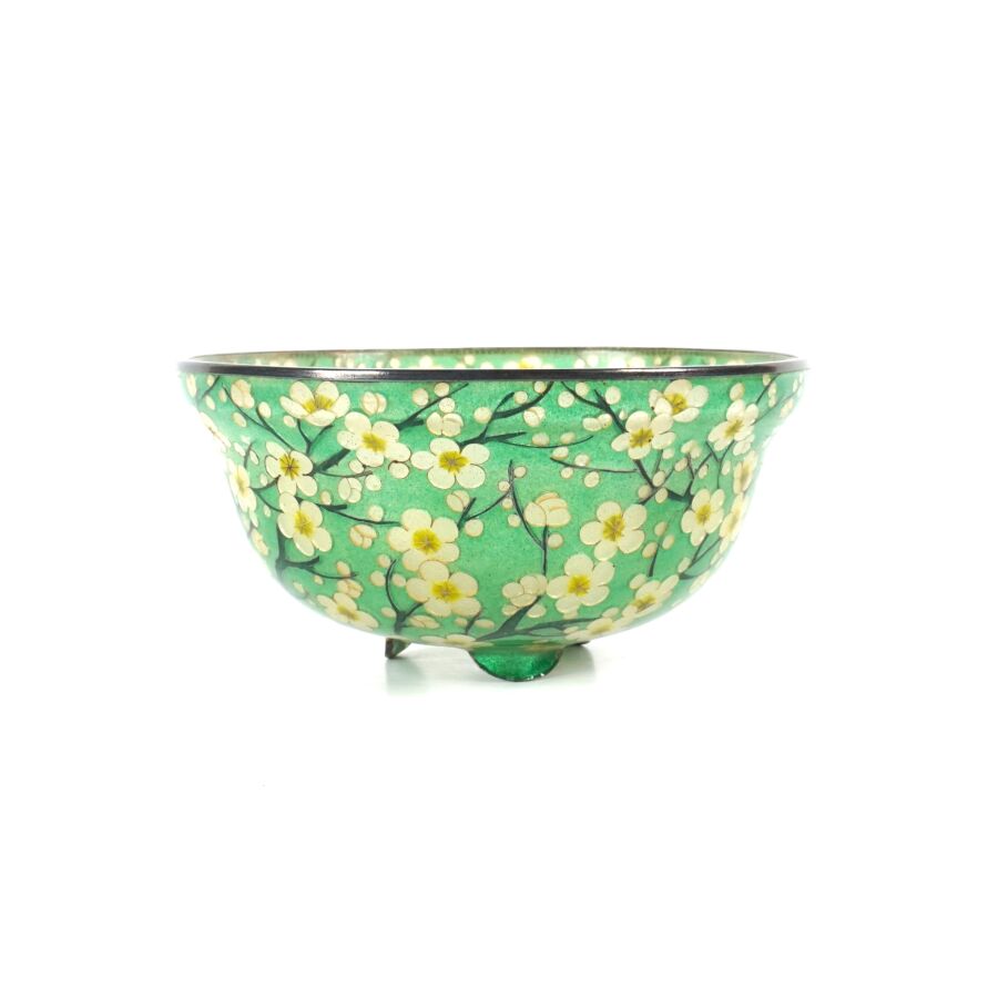 Coupe en verre émaillé vert et jaune, à motifs de fleurs de prunus, Japon, 20ème siècle, H. 6 cm. Diam. 12.7 cm.