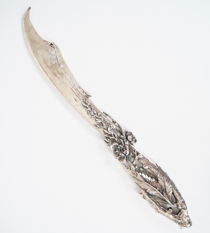 Coupe-papier en bronze argenté, la lame finissant par une tête d'aigle stylisée, le manche ajouré à décor de branches fleuries et feuillagées, L. 24 cm