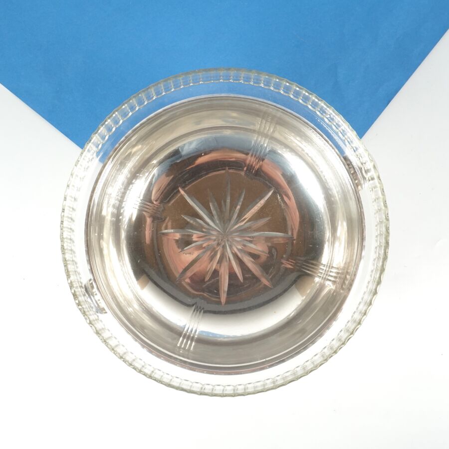 Coupe ronde sur léger piédouche, métal argenté, à deux anses latérales à enroulement, circa 1940, présentée avec une verrine (rapportée), D. 21 cm.