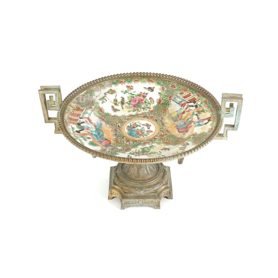 Coupe sur piédouche, la coupe composée d'un plat en porcelaine et émaux de style famille rose à décor d'oiseaux parmi des feuillages, insectes et de scènes animées sur une terrasse, Canton, Chine, monture en métal doré à décor de frises de laurier, deux anses latérales à la grecque, 20ème siècle, H. 20.2 cm. L. 31.5 cm (restaurations, oxydations, usures).