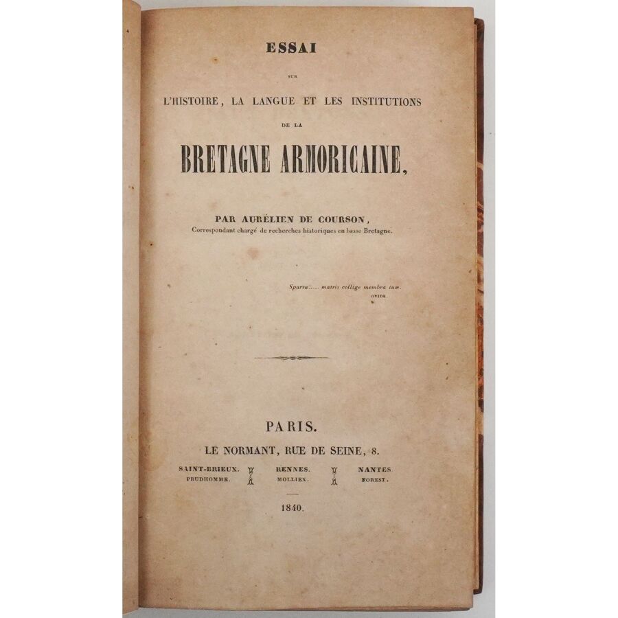 COURSON DE LA VILLENEUVE (Aurélien de). Essai sur l'histoire, la langue et les institutions de la Bretagne armoricaine. Paris, Le Normant, Saint-Brieuc, Prudhomme, Rennes, Molliex, Nantes, Forest, 1840. In-8, demi-basane marbrée, dos à nerfs orné d'une hermine centrale dorée, titre doré (reliure moderne).