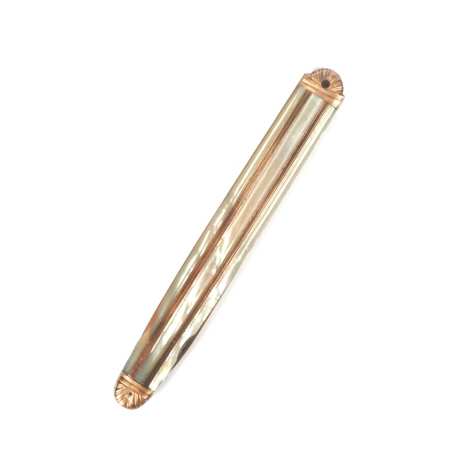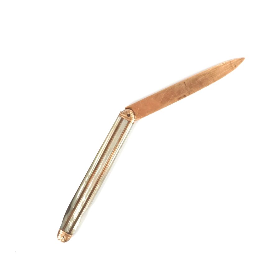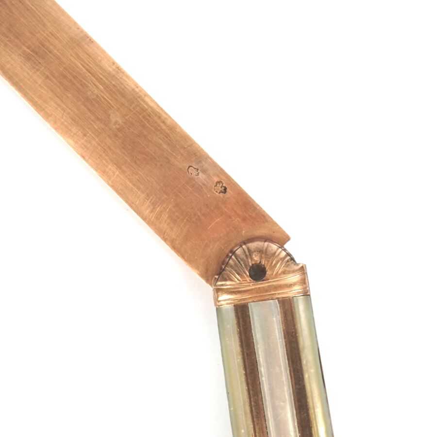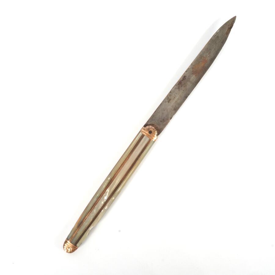 Couteau bi-lames, l'une en vermeil (925/oo), poinçon main ouverte, la seconde en métal, manche en or jaune 9K (375/oo) alternant plaques de nacre, d'époque Restauration, L. Fermé : 10.6 cm (usures). Poids brut : 33.7 g environ.