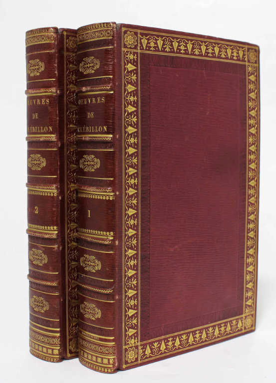 CREBILLON (Prosper Jolyot, de) - Oeuvres de Crébillon - Paris ; Chez Antoine-Augustin Renouard, 1818 - 2 volumes In-8° - 1 portrait frontispice de l'auteur par Saint-Aubin et 9 planches hors texte gravées en noir sous serpentes d'après Moreau le Jeune - Belle reliure maroquin rose soutenu à long grain (signée de Simier, relieur du roi en bas de dos du tome I) ornée d'une large dentelle dorée et de motifs frappés à froid sur chaque plat (d'infimes petits frottements) - Jolis dos à nerfs ornés à l'identique titrés et tomés or - Dentelles dorées à l'intérieur des plats - Traces de colle aux contours des gardes vertes (refaites ?) - De fortes rousseurs, éparses cependant - Tranches dorées.