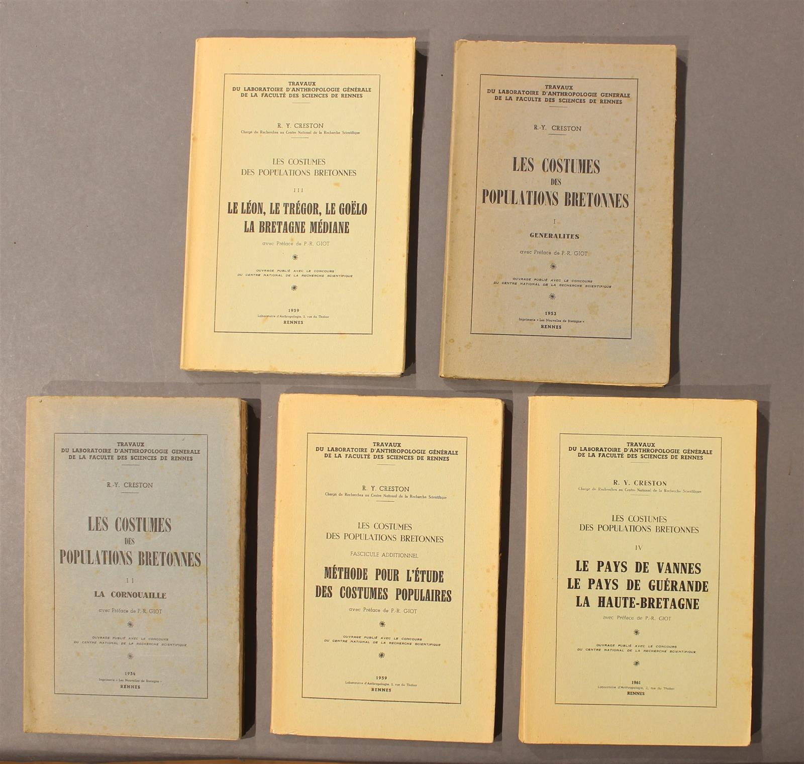 CRESTON (R.-Y.) - Les Costumes des populations bretonnes : Généralités - La Cornouaille - Le Léon, Le Trégor, le Goëlo, la Bretagne médiane - Le pays de Vannes, le pays de Guérande, la Haute-Bretagne - Méthode pour l'étude des costumes populaires - Rennes ; Imprimerie Les Nouvelles de Bretagne puis Laboratoire d'anthropologie, 1953 à 1961 - 5 volumes In-8° brochés - Très nombreuses figures in et hors-texte en noir (cartes, dessins, illustrations) - Quelques piqures à certaines couvertures sinon bons exemplaires au complet.