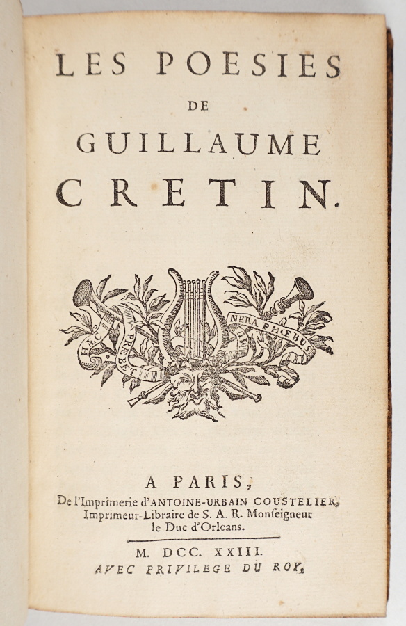 CRETIN (Guillaume) - Les Poésies de Guillaume Cretin - Paris ; Antoine-Urbain Coustelier, 1723 - 1 volume In-12° - Reliure de l'époque havane brune (plats et coins frottés) - Dos à nerfs orné (dédoré, coiffe supérieure arasée) - Pièce de tire maroquin bordeaux - Tranches mouchetées de rouge et de brun - Ex-libris gravé et armorié : A. Brölemann au 1er contre plat - Bon exemplaire.