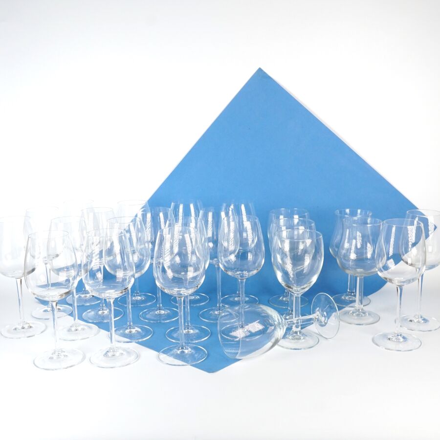 CRISTAL D'ARQUES : Partie de service de verres "oenologie" de dégustation en cristal, comprenant 18 verres (H. 20.3 cm), 4 verres (H. 18.1 cm) et on joint deux verres rapportés (H. 18.4 cm), avec leurs cartons d'origine (petites usures).
