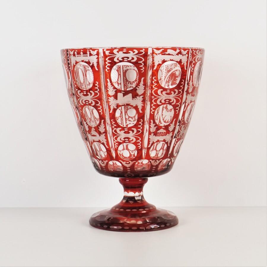 CRISTAL DE BOHEME : Grand vase sur piédouche en cristal taillé transparent et rouge à décor en léger relief d'animaux et d'un château, H. 23.5 cm, D. 19 cm (infime éclat sur la base).