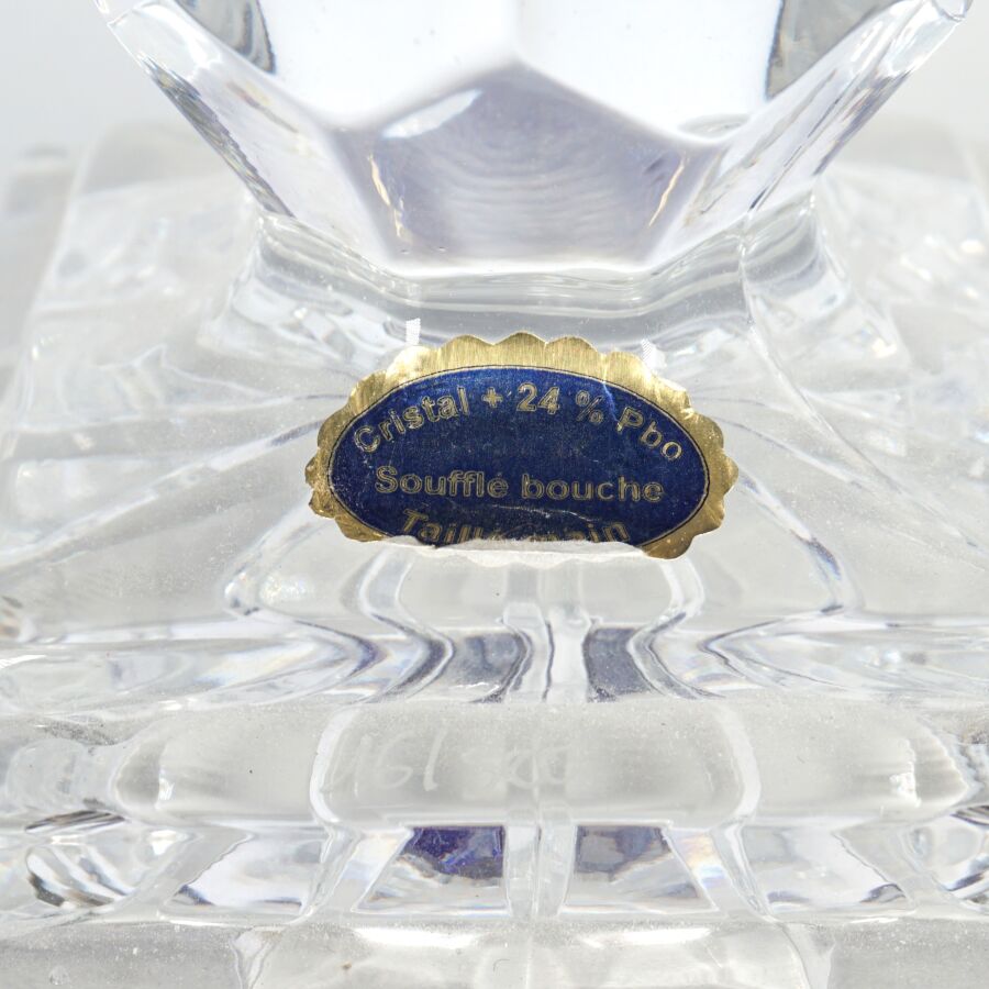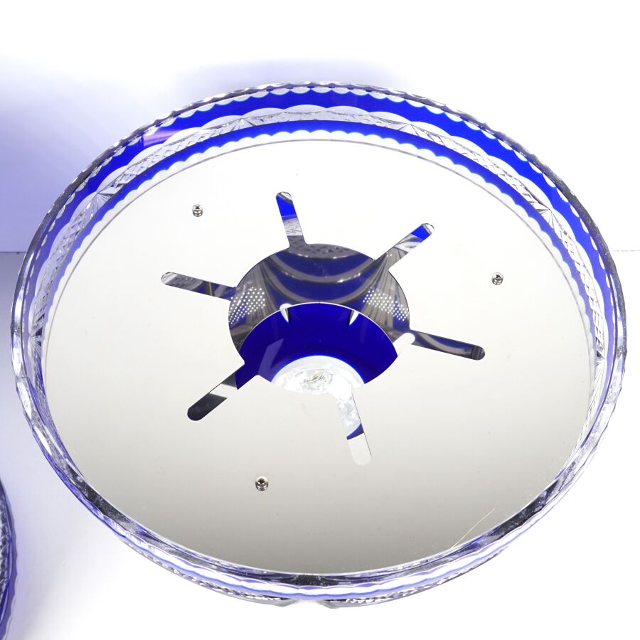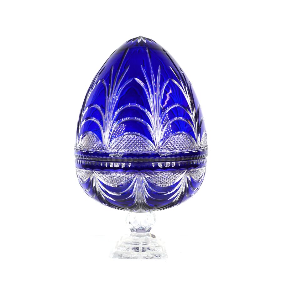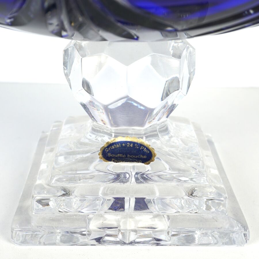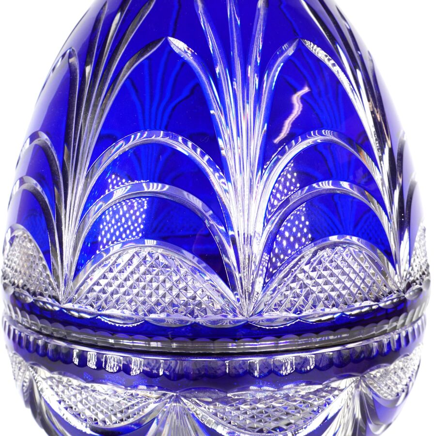 CRISTALLERIE DES GRANDS DUCS : Importante cave à champagne de forme ovoïde en cristal taillé et teinté bleu, ouvrant par moitié et découvrant un logement en métal à 6 compartiments, numérotée 16/500 sur la base, H. 48 cm. D. 29.5 cm.