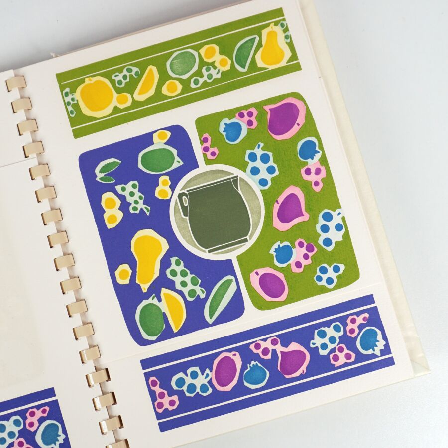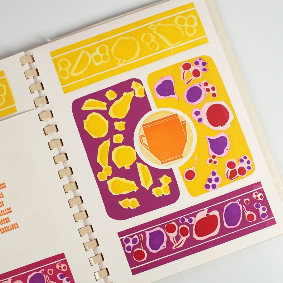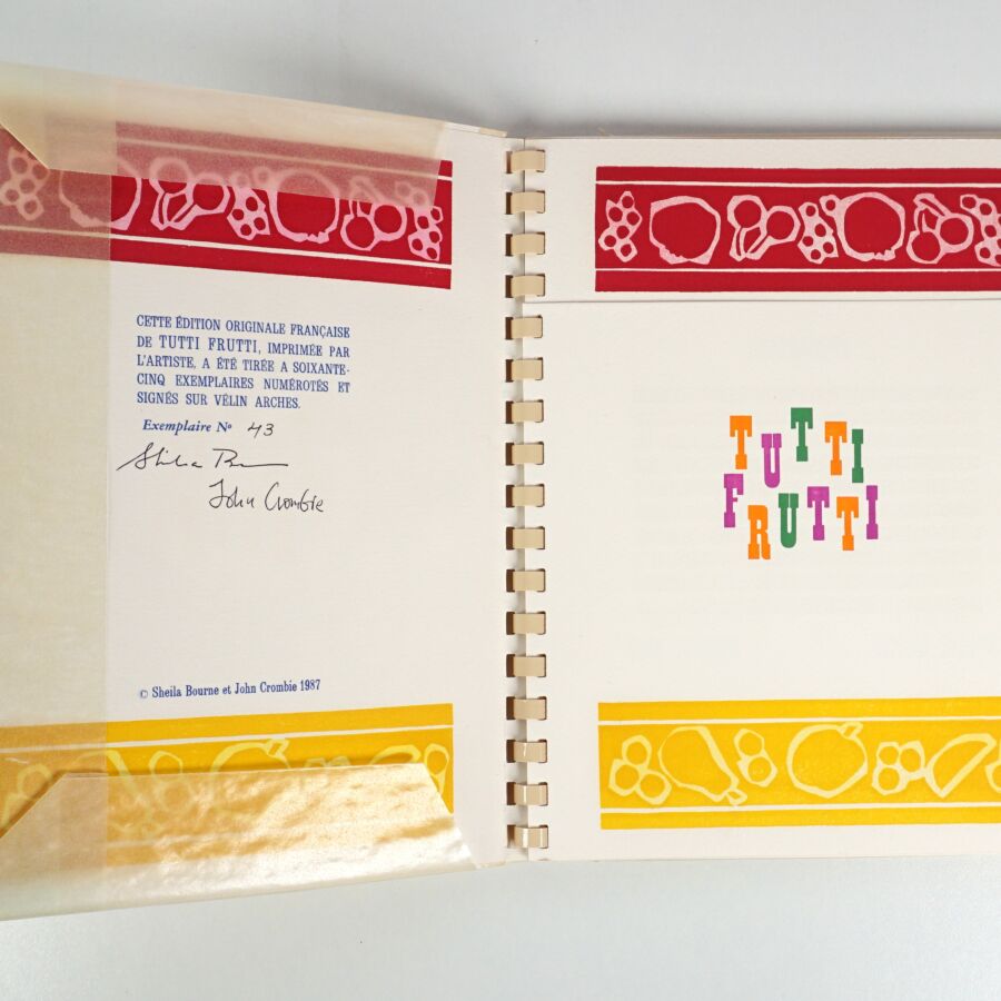 CROMBIE (John) & BOURNE (Sheila). Kickshaws Tutti Frutti. Paris, Kickshaws, 1987. Grand in-8 (25 x 19 cm) de 17 ff. reliés par une charnière à spirale plastique, couv. illustrée, étui violet. Édition originale française tirée à 65 exemplaires sur Vélin Arches, numérotés et signés par l'auteur et l'illustratrice (n° 43). Illustrations en couleurs. Ce livre d'artiste très coloré présente une conception combinatoire : les feuillets sont décalées vers le haut ou le bas afin de composer pour chaque page tournée une image différente grâce à la précédente. Il décline ""quinze boissons aux fruits permettant de faire un tour d'horizon rafraîchissant du spectre, guidé par la logique chromatique plutôt que par la disponibilité saisonnières des ingrédients.""