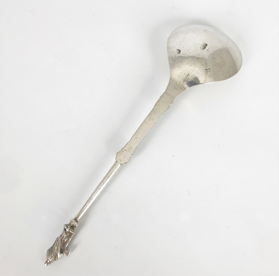 Cuillère à sauce en argent (800/oo) le manche à décor d'une colonne, se prolonge par une tige à pans coupés et se termine par un petit personnage, L. 19.5 cm. Poids brut : 60.5 g environ.