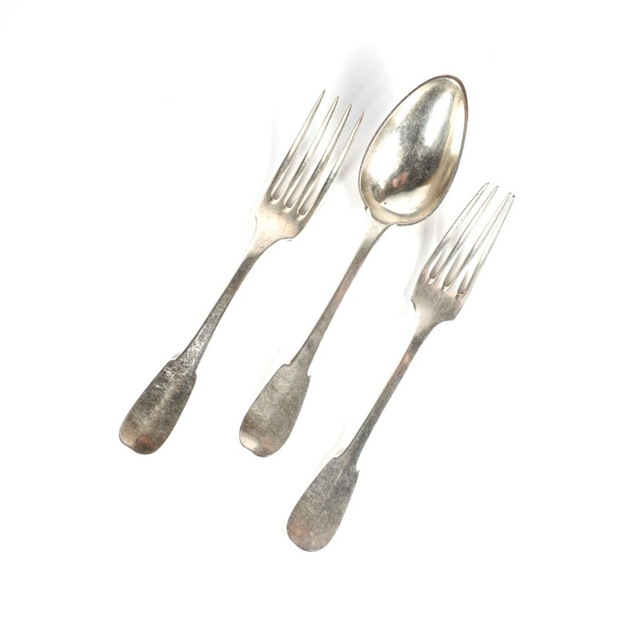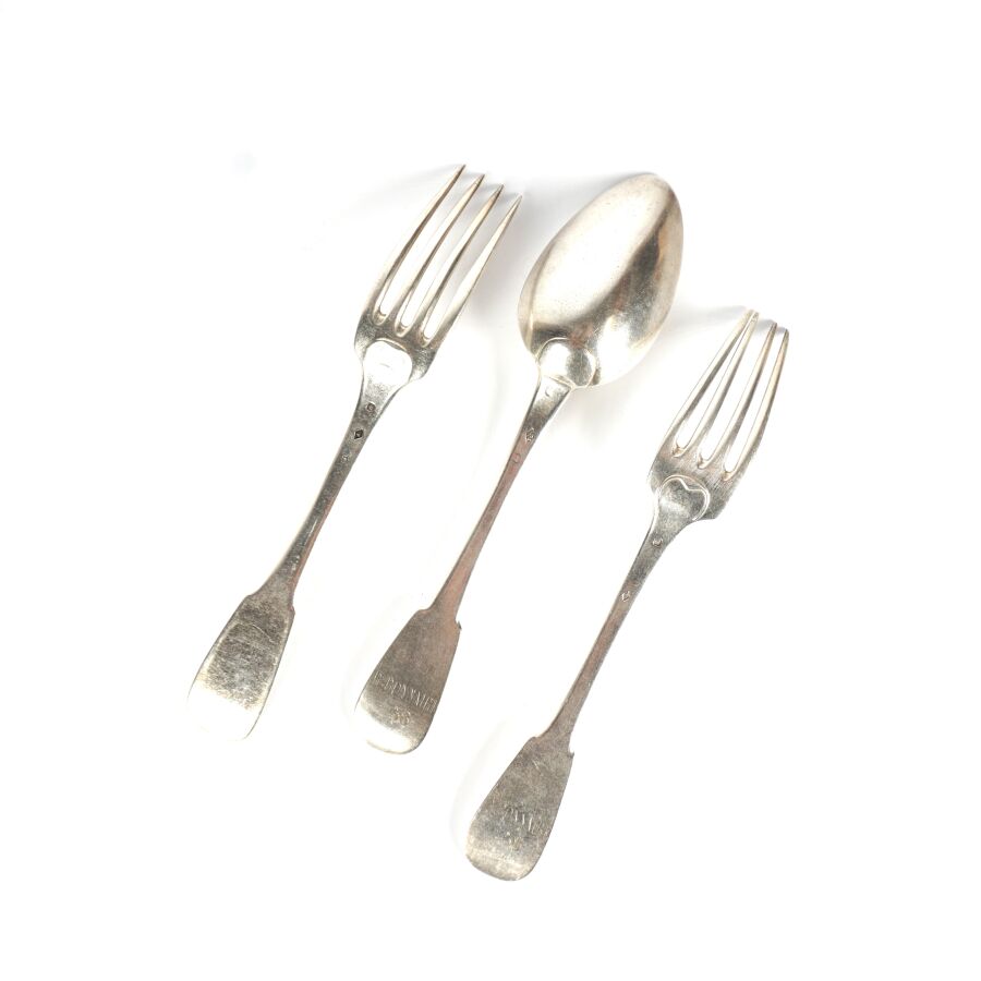 Cuillère et deux fourchettes en argent, poinçon Minerve 1er titre, comprenant :