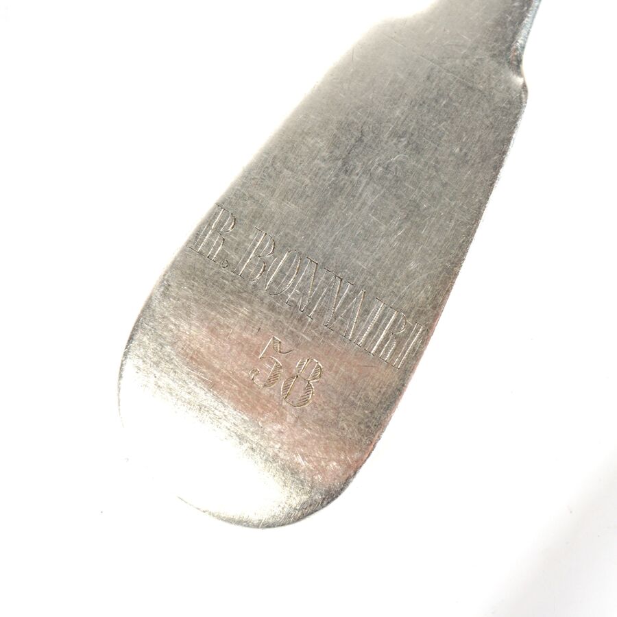 - Cuillère (poinçons quasi effacés), modèle uniplat, revers du manche marqué "R.Bonnaire 58"