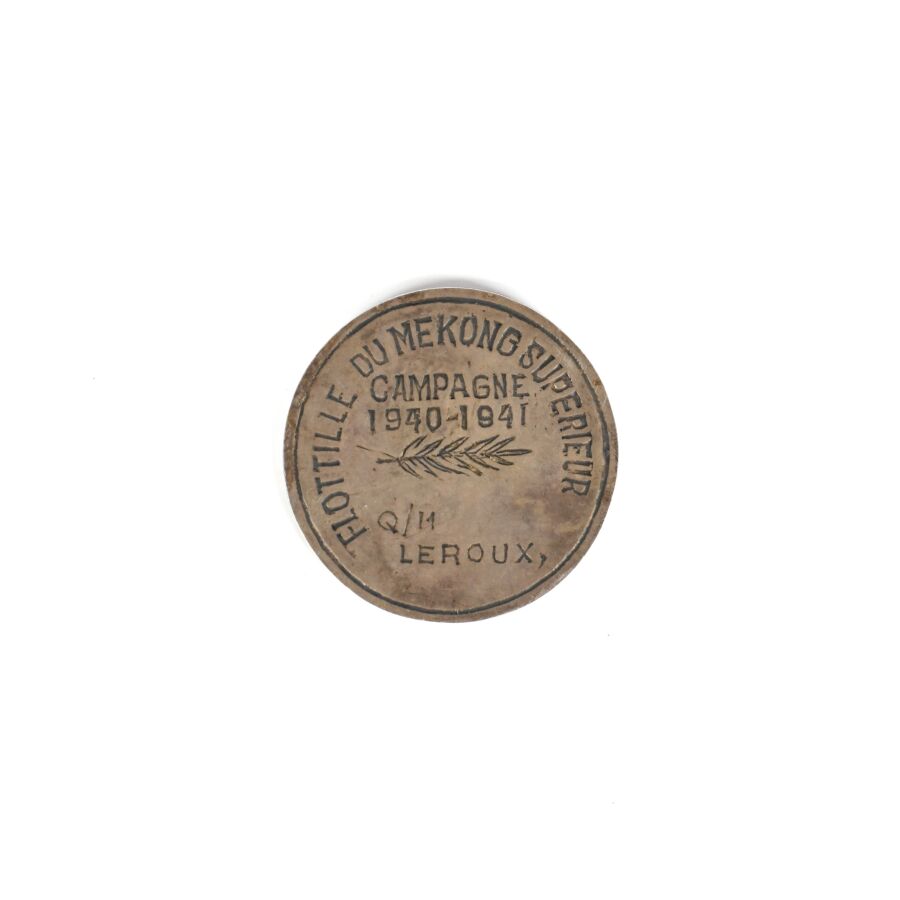 Curieux JETON FLOTILLE DU MEKONG SUPERIEUR, en argent ou métal argenté, 42 mm de diamètre, avers marqué " FLOTILLE DU MEKONG SUPERIEUR ", " Campagne 1940-1941 " et " QM LEROUX ", TBE.